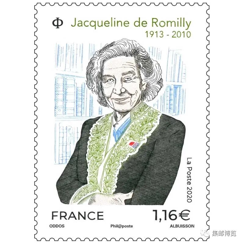 2020年2月10日,法国邮政发行一枚名人系列邮票,主题为法国著名古希腊文明和语言研究专家雅克利娜·德·罗米依(Jacqueline de Romilly,1913—2010)。她在1973年成为法兰西公学院首位女教授,是修昔底德和伯罗奔尼撒战争研究的权威,在古希腊哲学、政治思想和悲剧作家等研究领域著述丰厚。