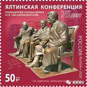 2020年2月10日,俄罗斯邮政发行一枚邮票纪念雅尔塔会议75周年。雅尔塔会议是美国(罗斯福)、英国(丘吉尔)和苏联(斯大林)三个大国在1945年2月4日至2月11日之间在黑海北部的克里木半岛的雅尔塔皇宫内举行的一次关于制定战后世界新秩序和列强利益分配问题的一次关键性的首脑会议。邮票图案为在会议原址伫立的纪念雕像。
