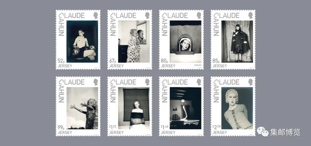 2020年2月12日,泽西岛邮政发行一套八枚《泽西岛艺术家》系列邮票,主题为女摄影师Claude Cahun(1894—1954)。这位超现实主义风格的摄影师、雕塑家和作家以自拍照出名,她出生在法国,1937年移居到泽西岛。她的摄影作品在当时是不允许公开的。她只展出过一件作品,其余都藏在盒子里。直到她的伴侣去世之后她的大量作品才被发现。