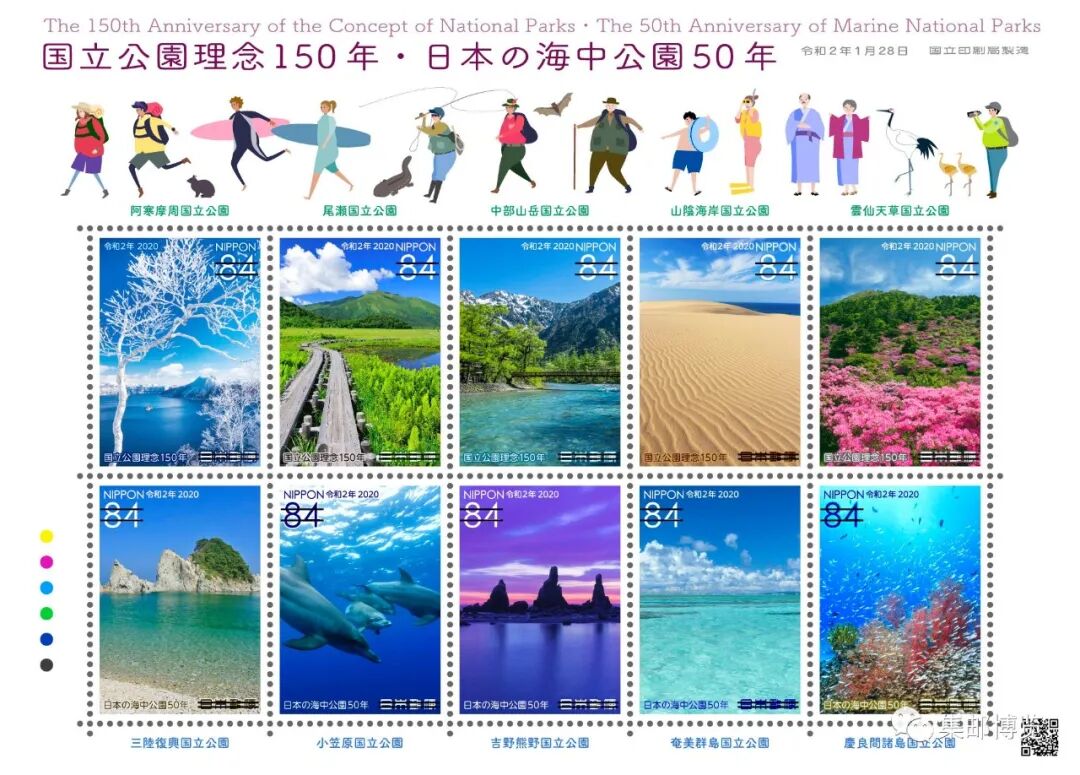 2020年1月28日,日本邮政发行一套10枚邮票,纪念国家公园理念问世150周年以及日本海洋国家公园制度设立50周年。1870年9月19日晚,一群探险者围坐在美国怀俄明州黄石地区两条河流汇合处的篝火旁,从保护生态的视角,破天荒地提出了将这里整块地盘划出来设立国家公园的设想。这次发行的10枚邮票上展现了阿寒摩周、尾濑、中部山岳、山阴海岸、云仙天草、三陆复兴、小笠原、吉野熊野、奄美群岛和庆良间诸岛国立公园的美景。