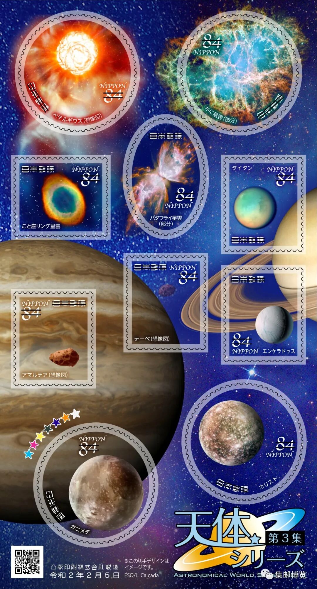 2020年2月5日,日本邮政发行《天体》系列第三集10枚邮票,展现金牛座蟹状星云、天琴座环形星云、天蝎座蝴蝶星云、土卫二和木卫三等天体。这套邮票的印制采用透明的全息薄膜,在改变观察角度的时候,可以看出发光的效果。