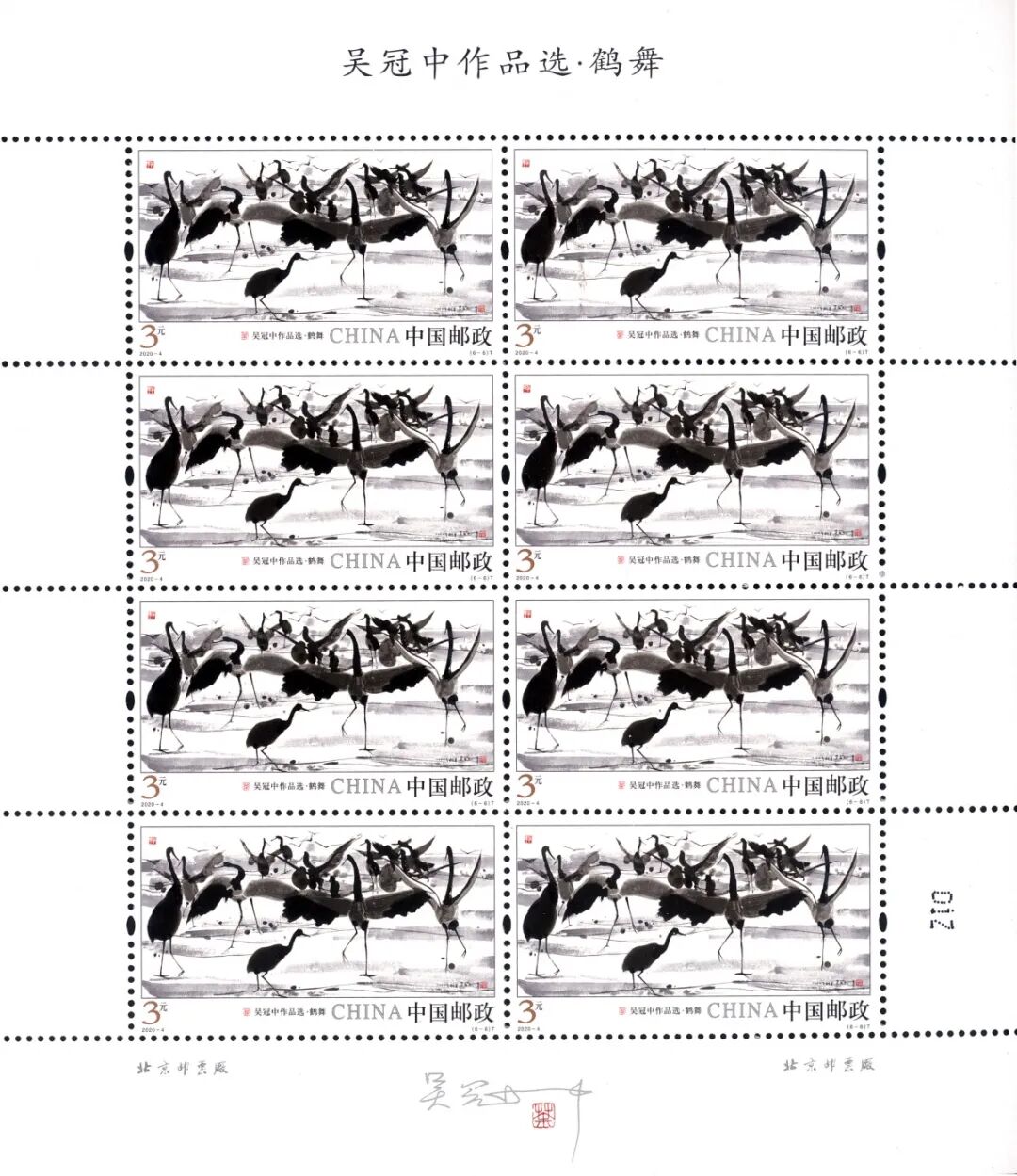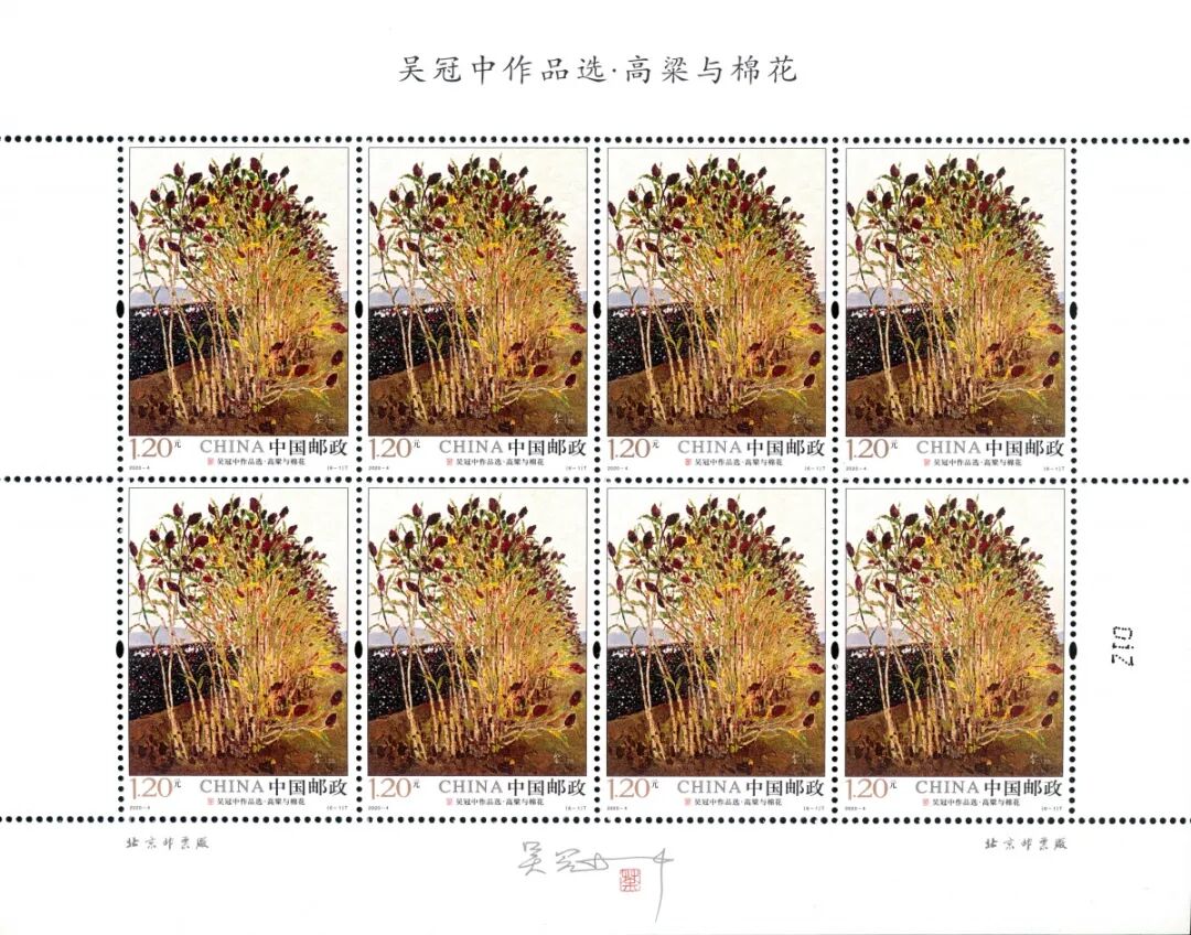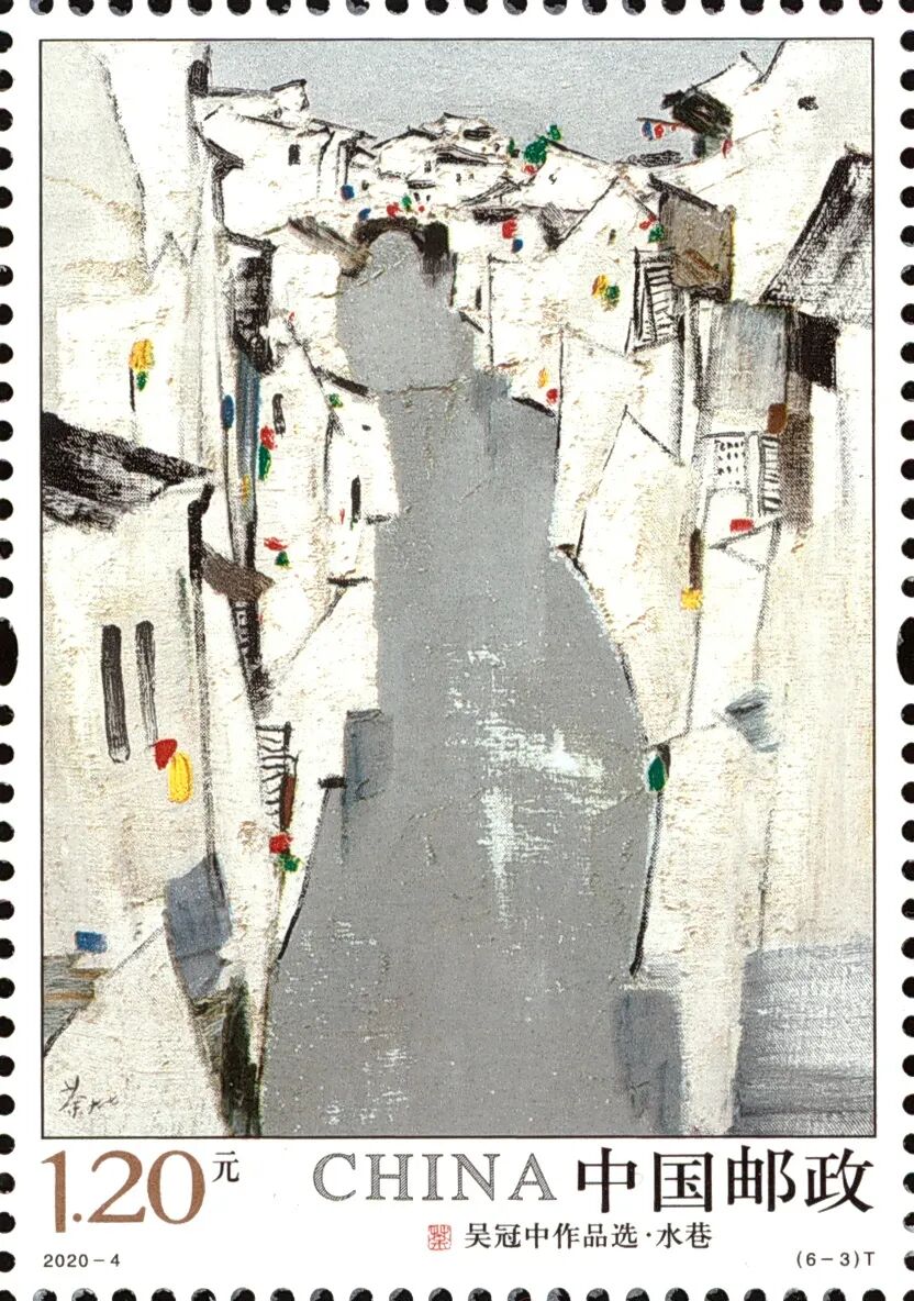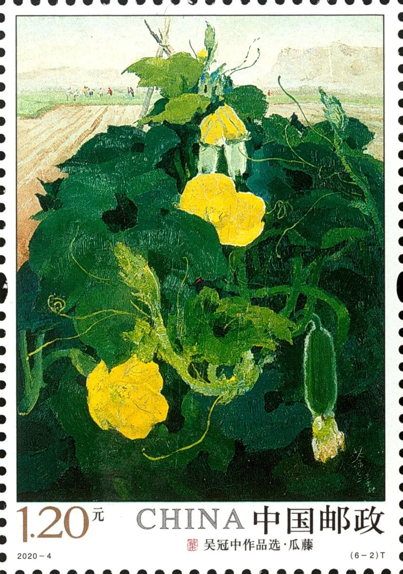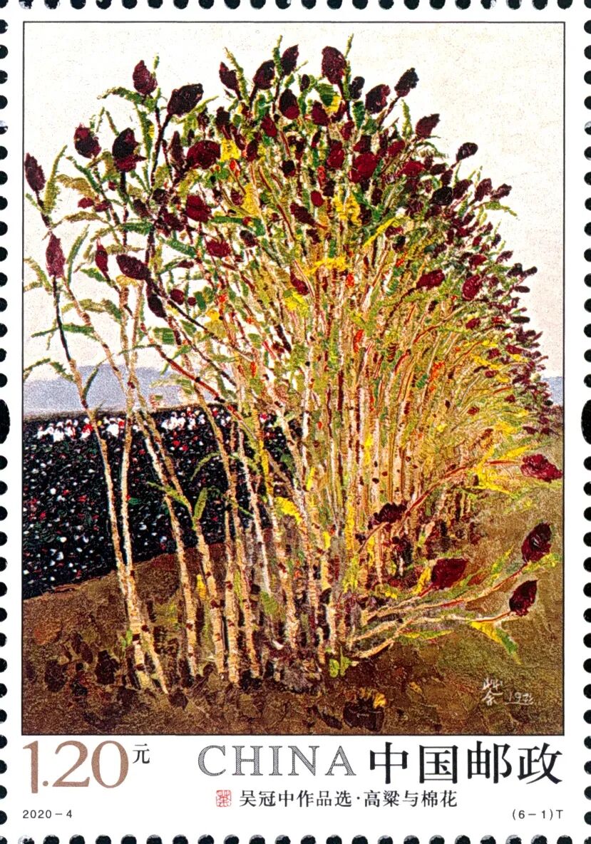 6枚邮票的表现内容选取了吴冠中先生的3幅竖式油画与3幅横式国画。“高粱与棉花”与“瓜藤”两幅为木版油画,是1972年在河北石家庄市获鹿县(今鹿泉区)李村创作的农村题材油画,现收藏于上海中华艺术宫。油画“水巷”表现了周庄的江南水乡风貌,创作于1997年,现藏于中国香港艺术馆。水墨画“巴山春雪”的画面营造了春雪覆盖山川的壮美景致,现藏于中国美术馆。水墨画“鹤舞”的画面布局零散有致,点、线、面完美结合,层次丰富,将中国水墨画推向了新的历史高度,现藏于新加坡美术馆。水墨画“双燕”取材于1980年浙江省宁波市的沿湖民居,在吴冠中众多以江南为题的作品之中,其最为得意的就是这幅“双燕”,现藏于中国香港艺术馆。