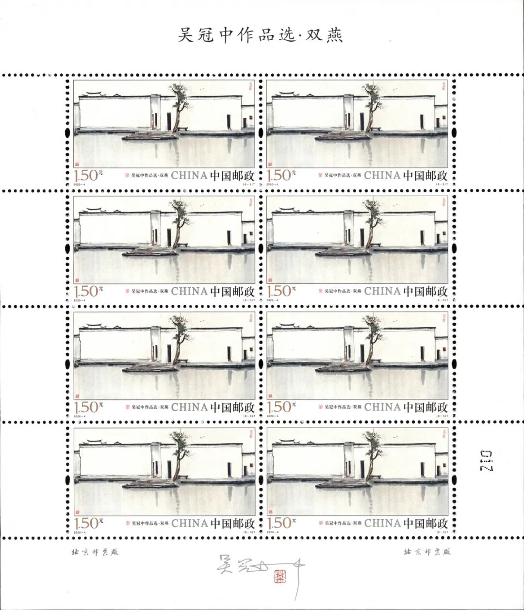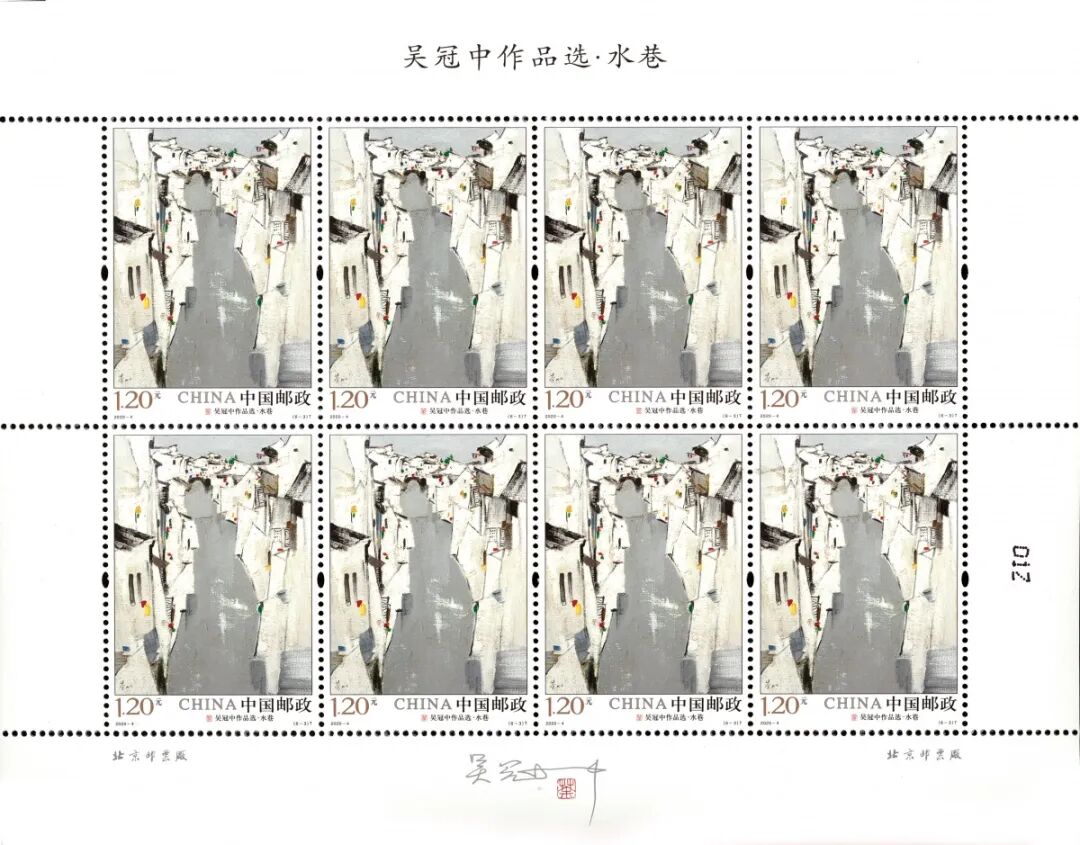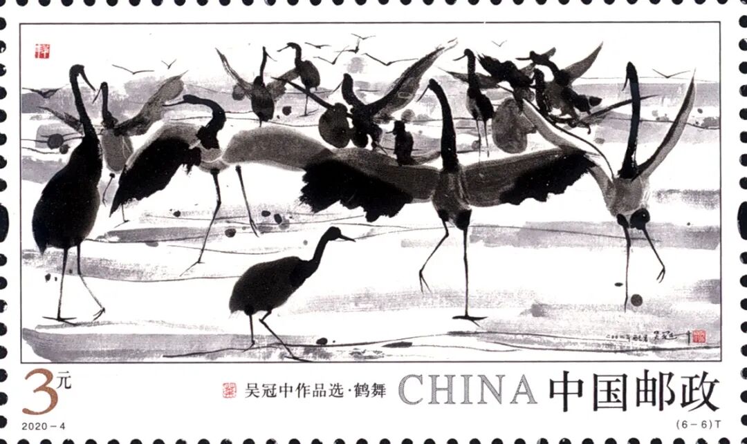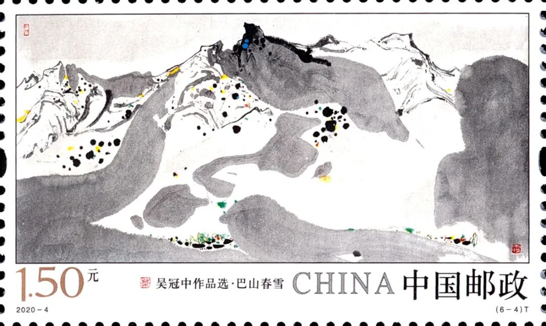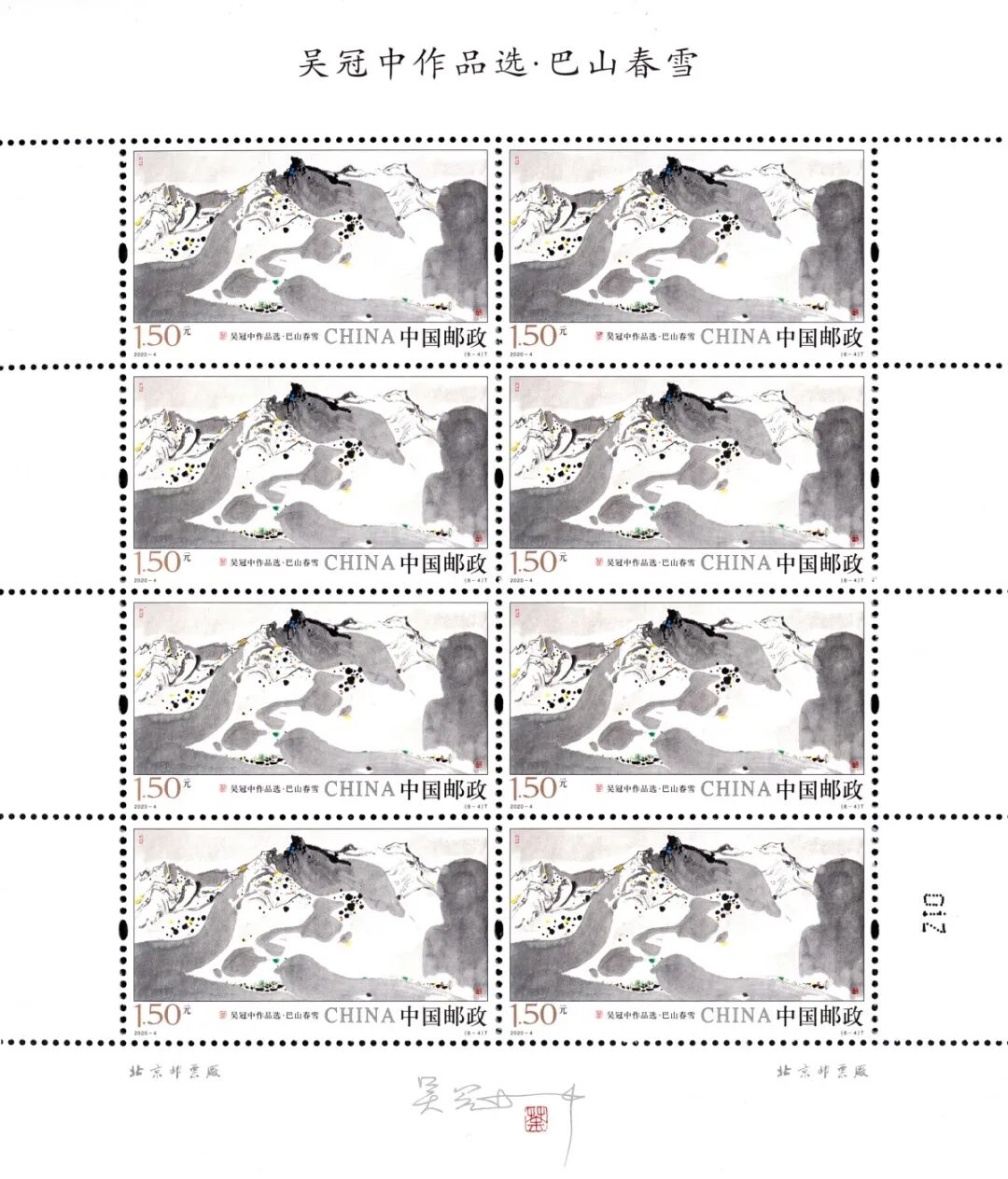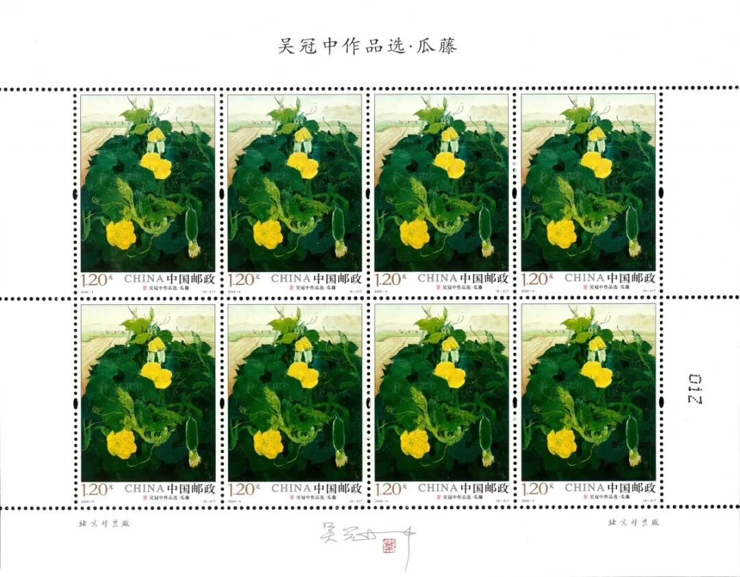6枚邮票的表现内容选取了吴冠中先生的3幅竖式油画与3幅横式国画。“高粱与棉花”与“瓜藤”两幅为木版油画,是1972年在河北石家庄市获鹿县(今鹿泉区)李村创作的农村题材油画,现收藏于上海中华艺术宫。油画“水巷”表现了周庄的江南水乡风貌,创作于1997年,现藏于中国香港艺术馆。水墨画“巴山春雪”的画面营造了春雪覆盖山川的壮美景致,现藏于中国美术馆。水墨画“鹤舞”的画面布局零散有致,点、线、面完美结合,层次丰富,将中国水墨画推向了新的历史高度,现藏于新加坡美术馆。水墨画“双燕”取材于1980年浙江省宁波市的沿湖民居,在吴冠中众多以江南为题的作品之中,其最为得意的就是这幅“双燕”,现藏于中国香港艺术馆。