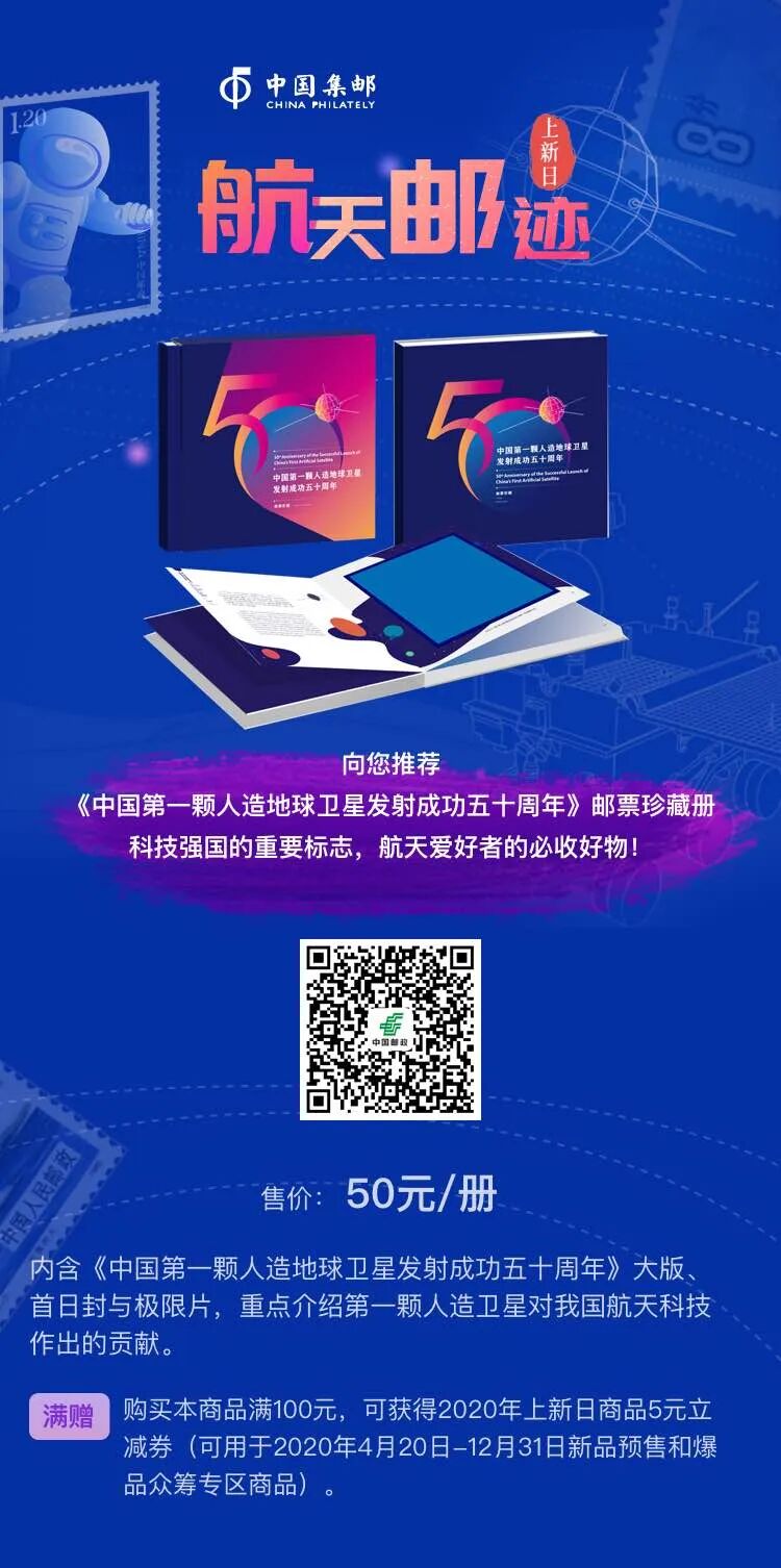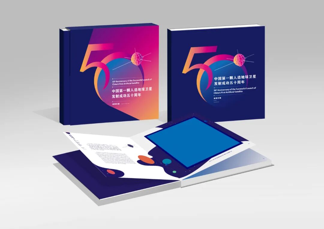 为配合该套邮票的发行,中国集邮总公司特别推出了《中国第一颗人造地球卫星发射成功五十周年》邮票珍藏册,以抽象的“50”字样作为邮册封面的主形象,突出第一颗人造地球卫星发射成功五十周年主题。背景选用深蓝色,象征太空及宇宙空间,彩色的“50”、人造卫星元素,凸显在深蓝色的背景中,彰显我国在航天事业上的辉煌成就。