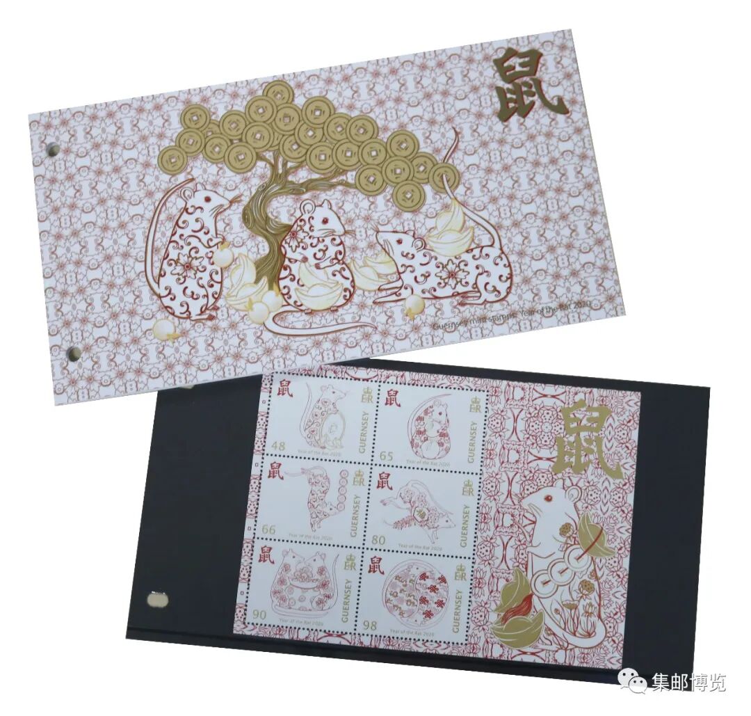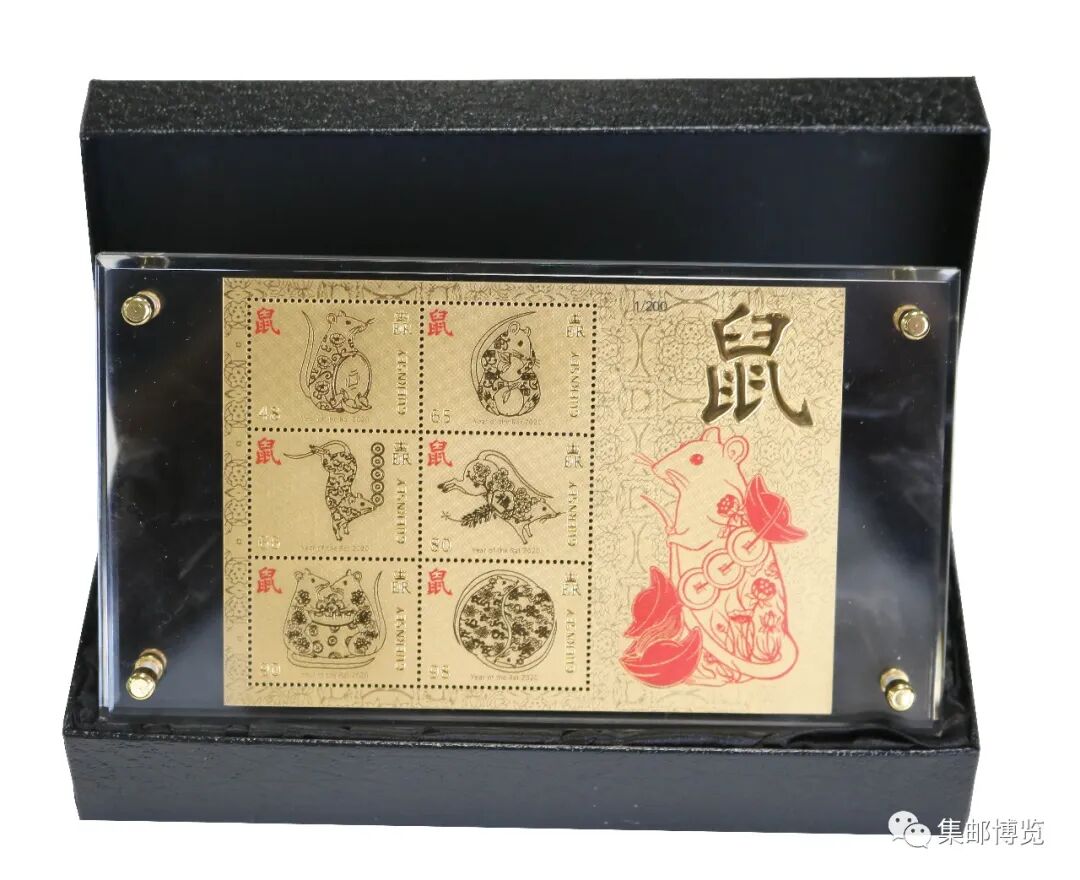 此外,配合本套新邮还发行了全套邮票邮折和小全张邮折以及包含6个小全张在内的未裁切大版张以及用24克拉黄金制作发行量仅200套的限量款小全张复制品等邮品。采用99.90%黄金打造的鼠年限量款小全张,每枚金箔小全张上均印序列号,规格为93×130毫米,夹放在双层亚克力展示板内,并被置于印有根西岛邮政徽志的黑色精美保护盒中,每套均附黑白色防伪证书。集邮者也可将小全张从展示板内取出,放在集邮册中保存。金箔鼠年小全张的售价为95英镑,全球限量发行仅200套。