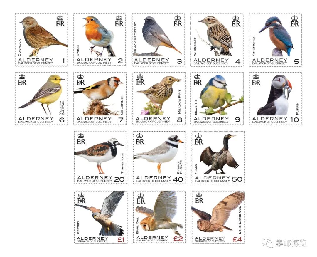 2020年1月21日为奥尔德尼岛发行《奥尔德尼岛的鸟类》普通邮票,全套16枚,邮票面值从最低1便士到最高4英镑不等,全套邮票总面值8.65英镑。尽管奥尔德尼岛仅有3.5英里长、不到2英里宽,但它却拥有非同寻常的生物多样性特征,是众多物种繁衍生息的绝佳避风港。根据奥尔德尼岛野生动物信托基金会的记录,这里拥有了大约284种鸟类,本次发行的邮票展示了这之中的16种常见鸟类。这是根西岛邮政首次为奥尔德尼岛发行普通邮票。