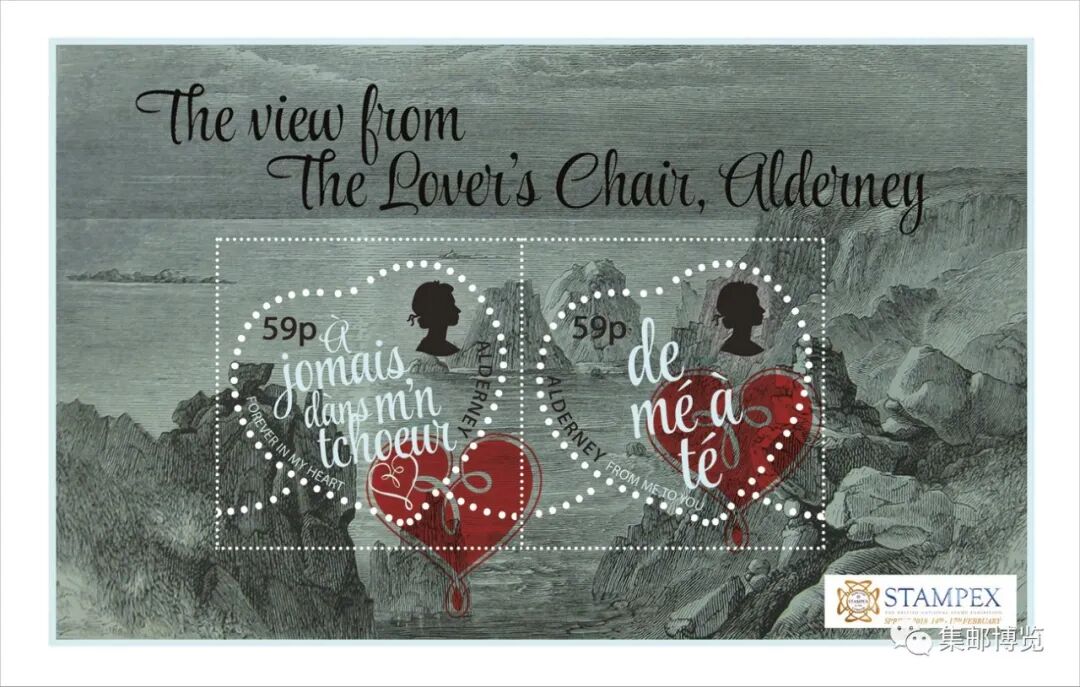 本次博览杂志同根西岛邮政合作,开展“我眼中的根西岛和奥尔德尼岛2020年1月新邮”活动,通过您阅读本篇文章和浏览根西岛邮政官网(www.guernseystamps.com),谈谈您欣赏根西岛和奥尔德尼岛2020年1月新邮后的看法。截至4月3日,小编将从全部留言中选出3位参与者的最佳留言,并为每位获奖者送上根西岛邮政2018年为奥尔德尼岛发行的《2018年春季英国国家邮票展览会》小全张。这枚《2018年春季英国国家邮票展览会》小全张于2018年2月14日发行。“英国国家邮票展览会”(英文简称Stampex)是英国国内规模最大的邮展,每年两次,分为春季邮展和秋季邮展,每次均在位于伦敦伊斯灵顿的商业设计中心举行,邮展历史已逾60年。2018年春季邮展于2018年2月14日至17日举行,根西岛邮政在邮展现场设立销售摊位,开幕日恰逢西方传统的“情人节”,为此根西岛邮政为奥尔德尼岛发行的这枚小全张也同时为庆祝情人节而发行。小全张包含两枚面值均为59便士的“票中票”邮票,每枚邮票的外框为正方形,打印齿孔,中间则为心形邮票,小型张右下部边纸还印有Stampex的徽志。小全张背景图案选自奥尔德尼岛十九世纪著名画家保罗·雅各布·纳佛特尔的画作,描绘了当地名为“爱情之椅”的岩石,它是奥尔德尼岛当地流传的爱情故事中男女主人公约会的地方。