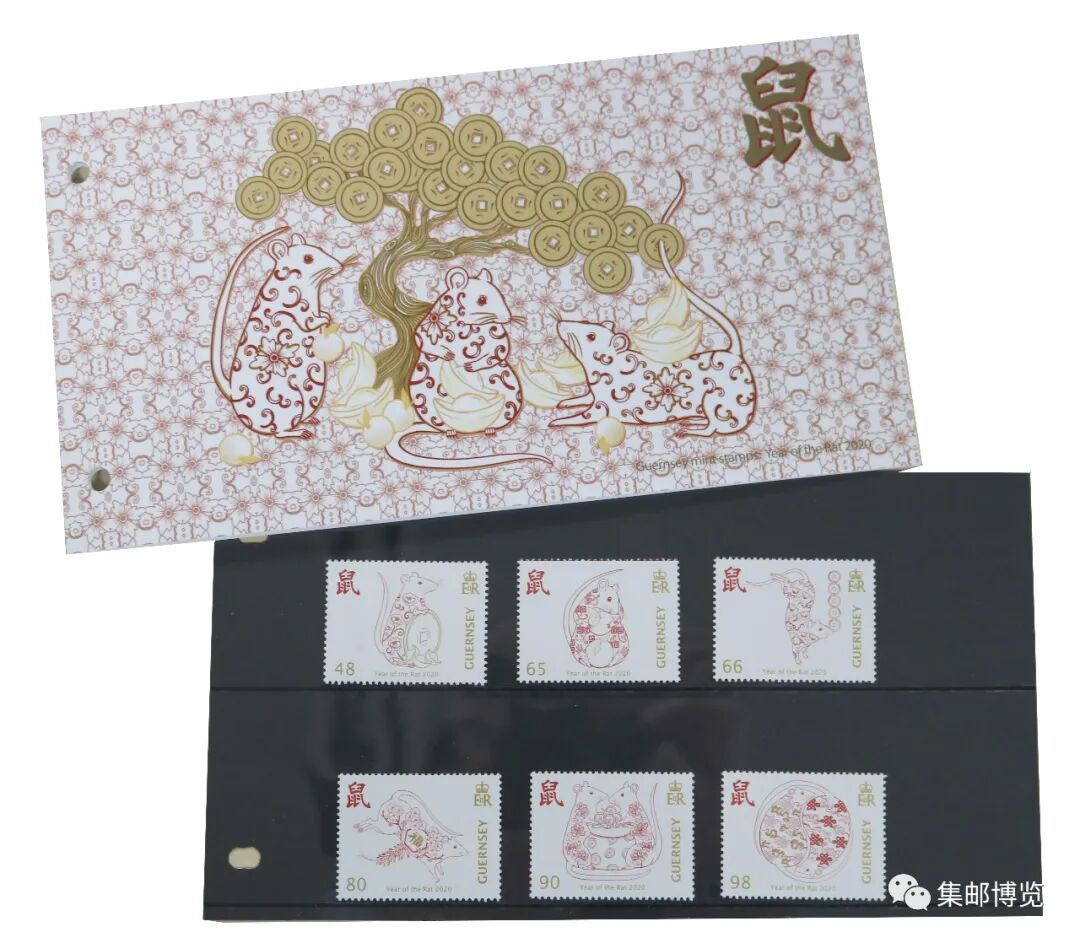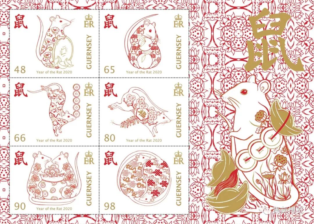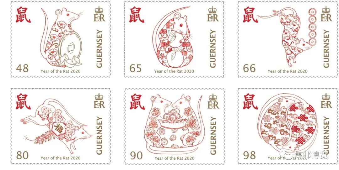 英属根西岛邮政于2020年1月8日发行中国生肖鼠年邮票,这是根西岛发行的第七套中国生肖系列题材邮票。同往年相同,根西岛推出的《2020中国生肖鼠年》邮票共6枚,面值4.47英镑,另发行含6枚邮票的小全张。该套中国生肖题材邮票继续由旅居澳大利亚的华裔艺术家克丽茜•刘(Chrissy Lau)女士负责设计。邮票在布局方面延续前几组生肖邮票的风格。首先,全套邮票仍采用6枚邮票+小全张的组合形式。其次,在颜色运用方面,以中国传统文化中的红色作为勾勒邮票线条的主打色调,兼以金色点缀和配饰,象征着喜庆和欢乐,每枚邮票的左上角部位均以红色印有中文“鼠”字。同时,邮票中的部分图案和邮票面值、国别铭记、英文“2020年鼠年”文字及徽志均以金色印制,金色象征着财富、富足和繁荣,加之2020年为“金鼠年”,采用这样的颜色更加映衬了邮票主题,充满美好的寓意。