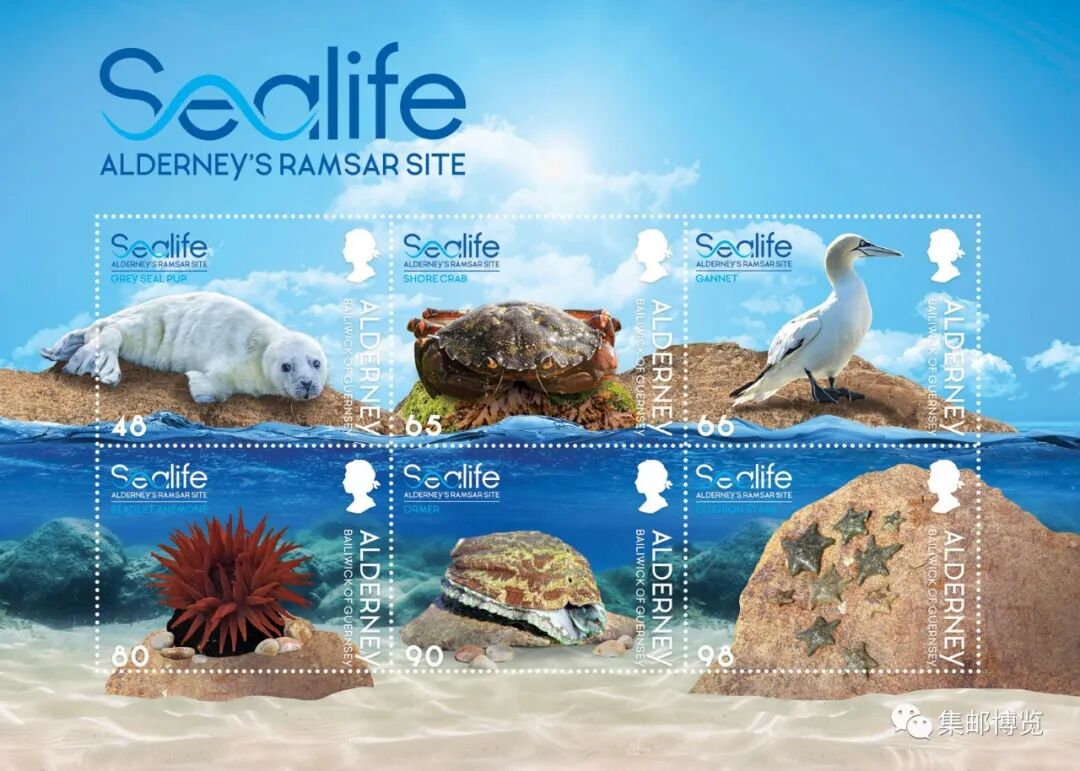根西岛邮政还在1月21日为奥尔德尼岛发行《奥尔德尼岛受保护湿地的海洋生物》邮票,全套6枚,面值4.47英镑,同时发行包含全套邮票的小全张,邮票和小全张展示了生活在奥尔德尼岛西海岸和其所属巴劳岛的海洋生物,包括灰海豹、食草蟹、塘鹅、等指海葵、鲍鱼和海星。这一区域的总面积为1500公顷,大于整个奥尔德尼岛的陆地面积,在2005年被国际湿地公约组织(RAMSAR)确定为受保护湿地,是海峡群岛的八大保护湿地之一。