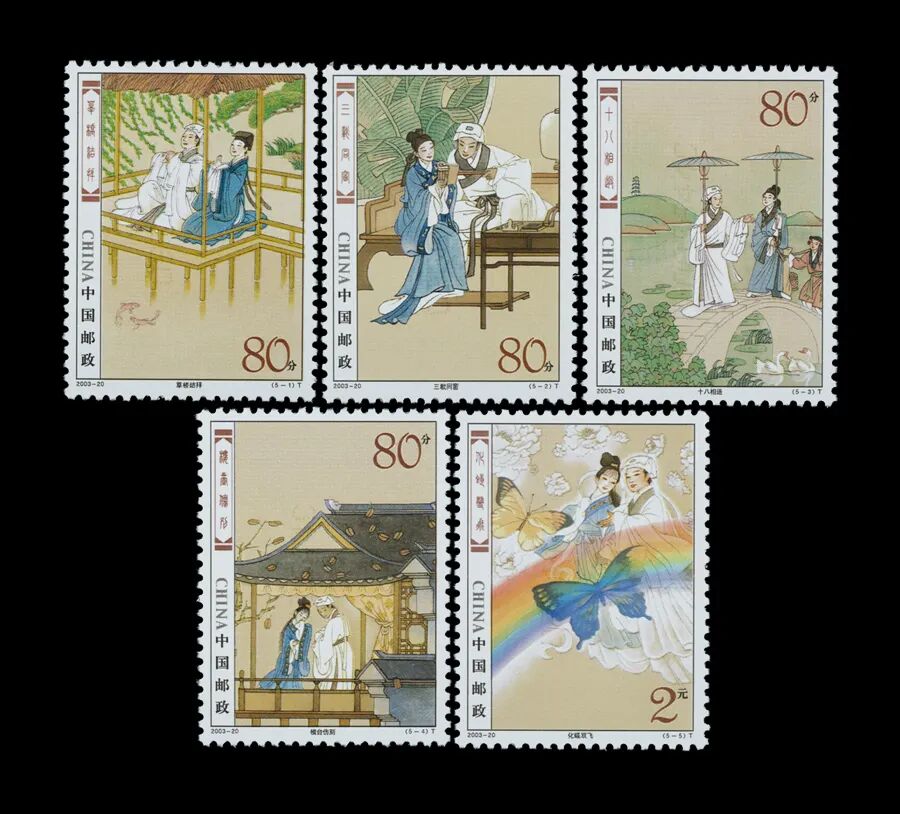 “梁祝”的故事,凄婉动人,被称为东方“罗密欧与朱丽叶”的爱情故事。为了展现中华民族历史悠久和优美的民间传说,中国邮政于2003年10月18日发行了《民间传说——梁山伯与祝英台》特种邮票,1套5枚。这套邮票5幅图案均是以中国第一部彩色影片(越剧)《梁山伯与祝英台》的剧情为蓝本进行设计的,向世人展示了草桥结拜、三载同窗、十八相送、楼台伤别和化蝶双飞这五个桥段。