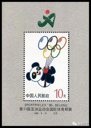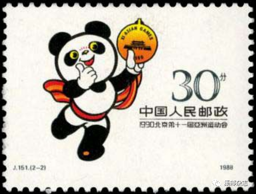 北京亚运会吉祥物是一只手举奖牌的大熊猫,名字叫做“盼盼”。中国邮政于1988年7月20日发行的J.151《北京第十一届亚洲运动会》(一)邮票的第二枚主图就是“盼盼”。1990年9月21日,中国邮政发行了《第11届亚洲运动会国际体育邮展》小型张,“盼盼”再次成为邮票的主图。