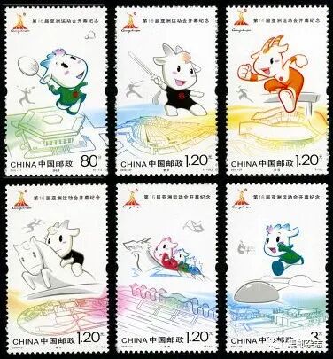 2010年11月12日,广州亚运会开幕。为此中国邮政于当天发行《第16届亚洲运动会开幕纪念》邮票一套6枚,图案分别为羽毛球、武术、田径、马术、龙舟、围棋。本届亚运会吉祥物再次登上邮票。