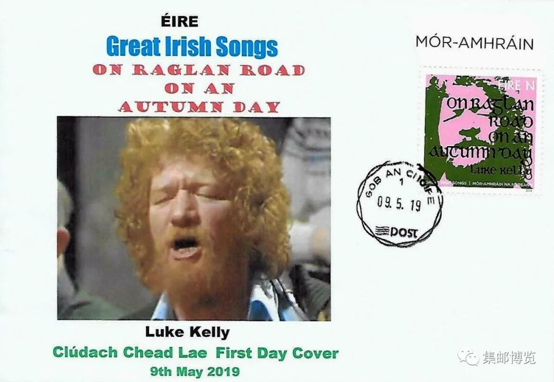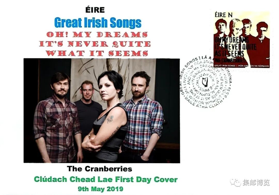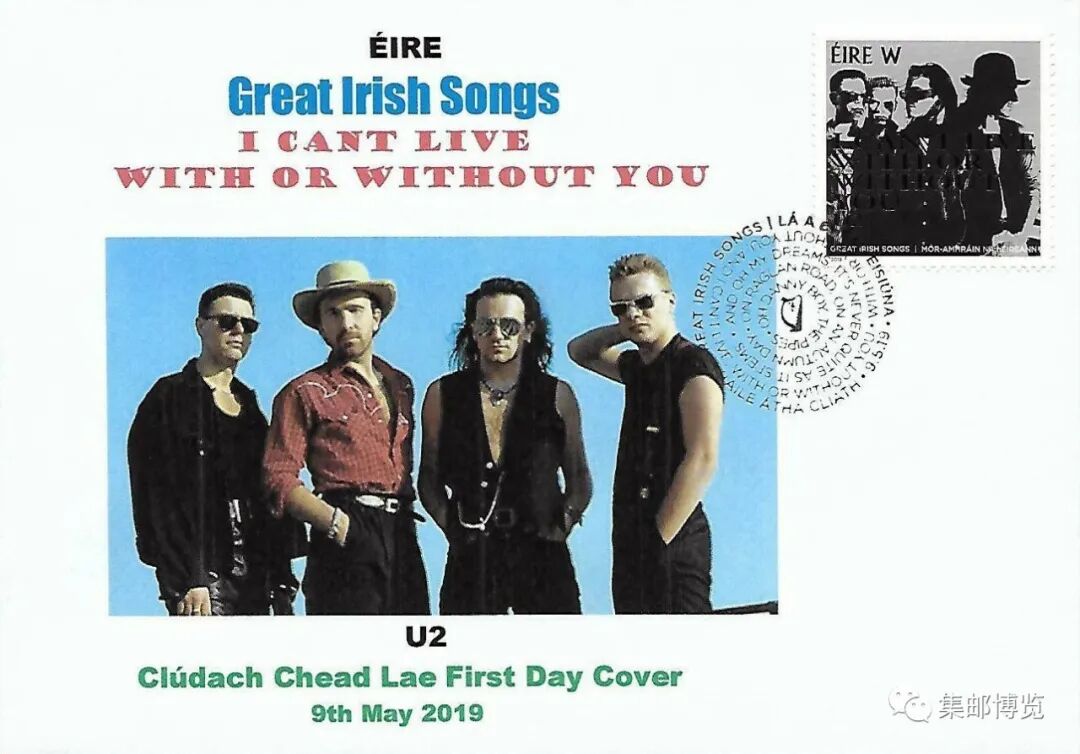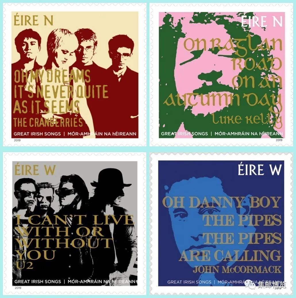2019年5月9日,爱尔兰发行《伟大的爱尔兰歌曲》邮票1套4枚,N(售价1欧元)、W(售价1.7欧元)类邮资各2枚,图案记录了该国蜚声世界歌坛的乐队、歌手及各自演唱的经典作品,分别为:小红莓乐队《梦》、卢克·凯利《在拉格伦路上》、约翰·麦科马克《丹尼男孩》和U2乐队《有没有你》。