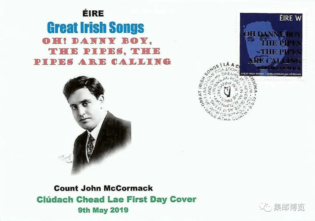 第3枚邮票“约翰·麦科马克《丹尼男孩》”为W类邮资,主图呈现了约翰·麦科马克的肖像,所附文字为歌曲的第一句歌词“哦,丹尼男孩,笛声正在召唤”。《丹尼男孩》又称“伦敦德里小调”,是一首在爱尔兰已传唱百年的民谣,其背景故事版本较多,主要围绕父子别离展开。后来,歌曲的歌词由3段增加到4段,从而形成了忧郁与缱绻交织的特点。约翰·麦科马克(1884.6.14-1945.9.16),爱尔兰著名男高音歌唱家,擅长歌剧和流行音乐,因对音乐界贡献突出而获得诸多荣誉和勋章,其演唱的《丹尼男孩》深受民众喜爱。