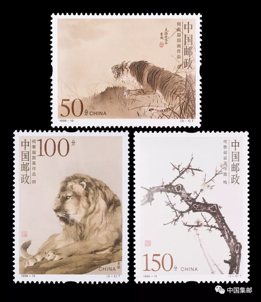 她的绘画作品,不仅是中国现代史的缩影,也是她70年革命生涯和高尚人格的生动写照,是中华民族画苑中的瑰宝。1998年6月27日,为纪念何香凝诞辰120周年,中国邮政发行了《何香凝国画作品》特种邮票,以其最具代表性的三幅作品为图案,首次采用异形齿孔(椭圆形),打开了异形齿孔印制邮票的先河;在第一枚邮票左右两边和第二、三枚邮票的上下两边,各打有一椭圆形齿孔,给人耳目一新之感。