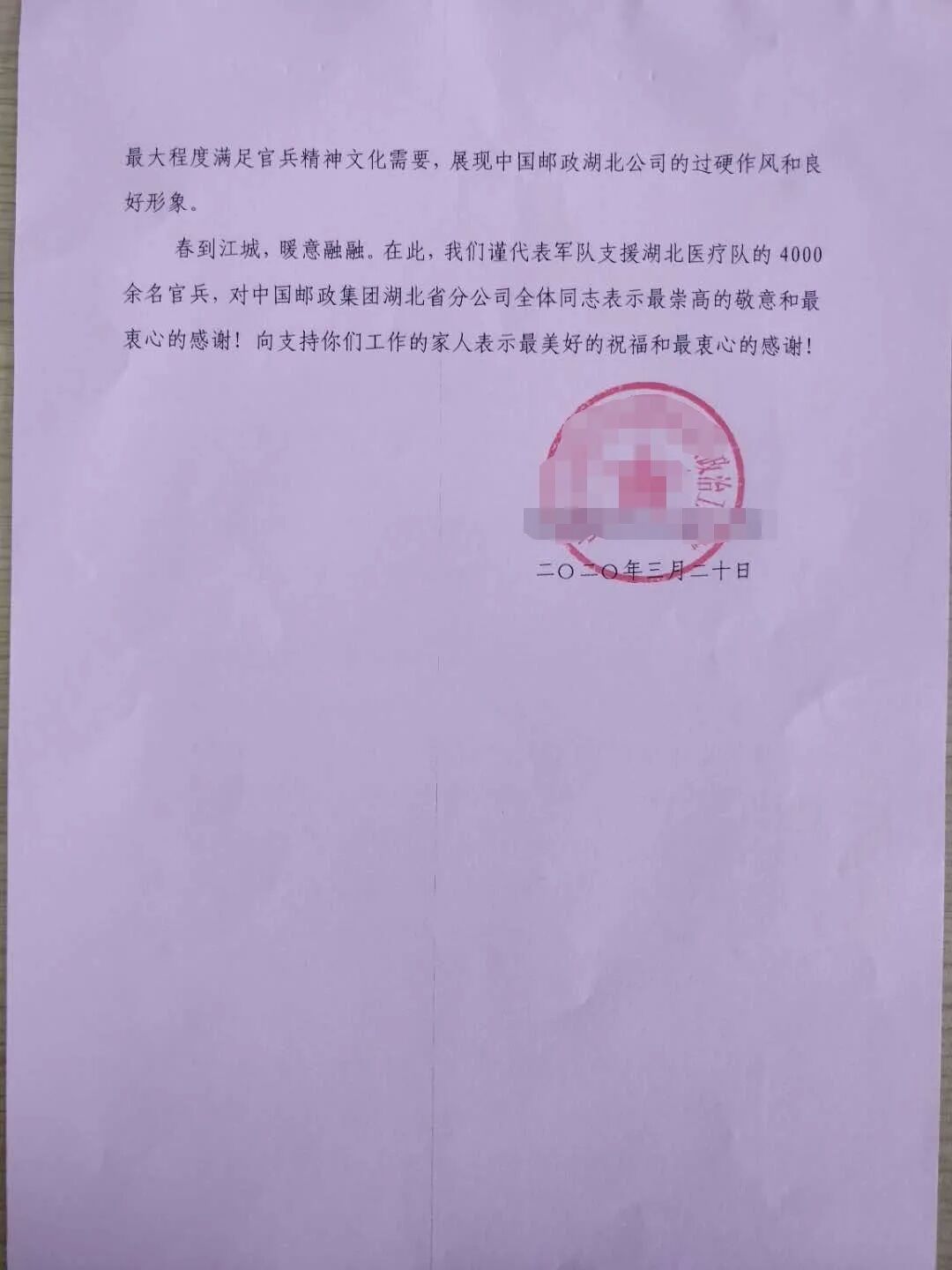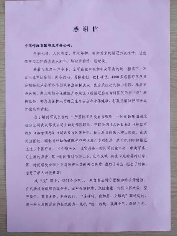 近日,湖北省邮政分公司收到了中国人民解放军某部队政治部发来的感谢信,信中称赞武汉市邮政分公司在疫情肆虐、危险重重的情况下,英勇无畏、向疫而行,主动及时送达党报党刊,第一时间传达党的声音,最大限度满足官兵精神文化需求,充分展现邮政的过硬作风和良好形象,并代表军队支援湖北医疗队全体官兵,对湖北邮政表示最崇高的敬意和最衷心的感谢。