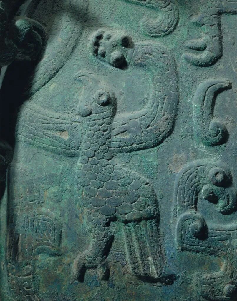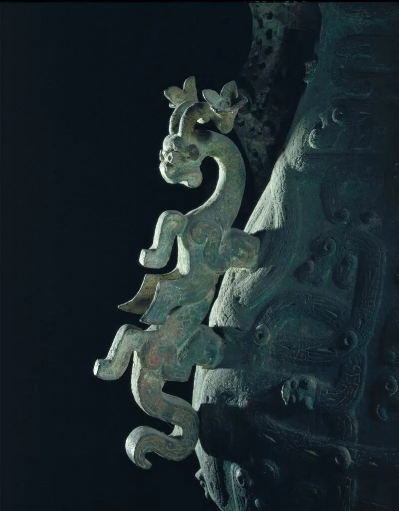 大家都知道,春秋时期,青铜器的铸造工艺有了飞速发展,如“失蜡法”的发明。但这一阶段青铜器铸造工艺的成就并不仅仅体现在创新上,对于一些优秀的传统工艺,也予以继承并发扬光大,如“分铸法”。就像我身上的仙鹤、双龙耳与器身主体便是采用的分铸法,既显示了高超的铸造技术,也反映了当时青铜器上动物造型肖像化的潮流。