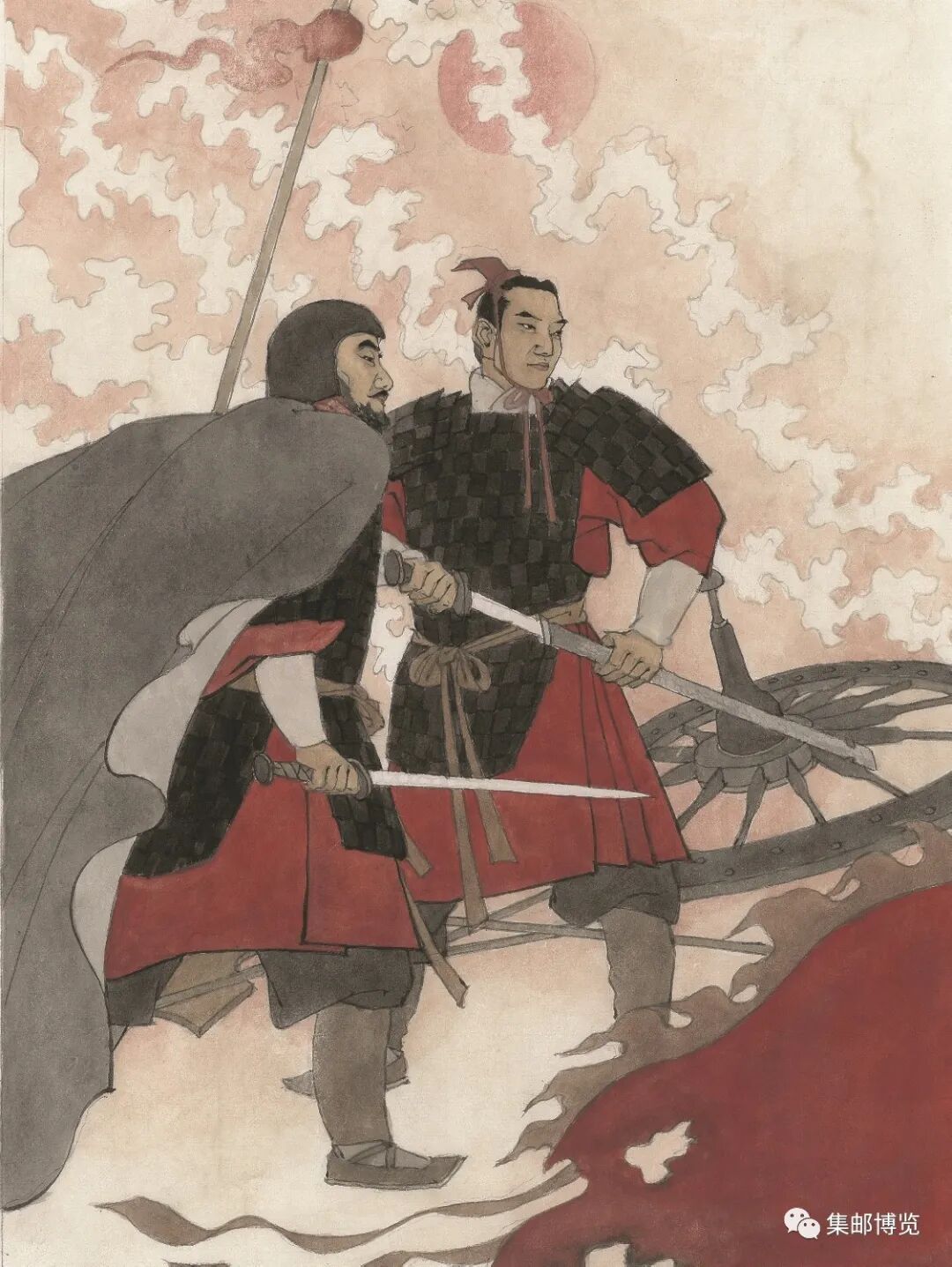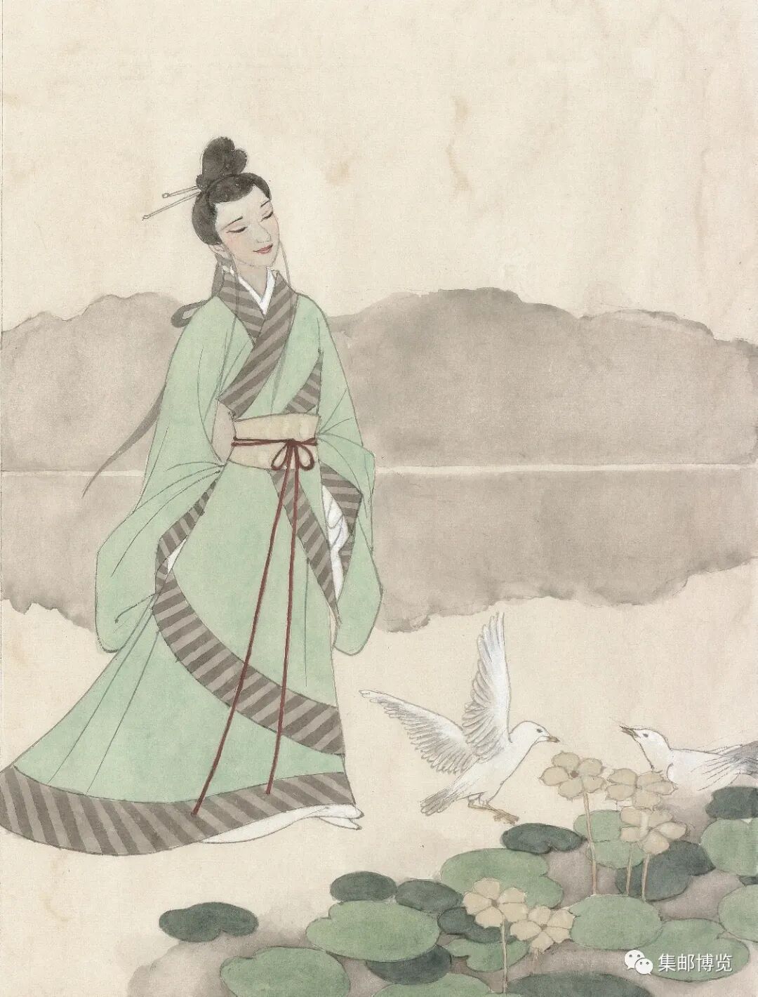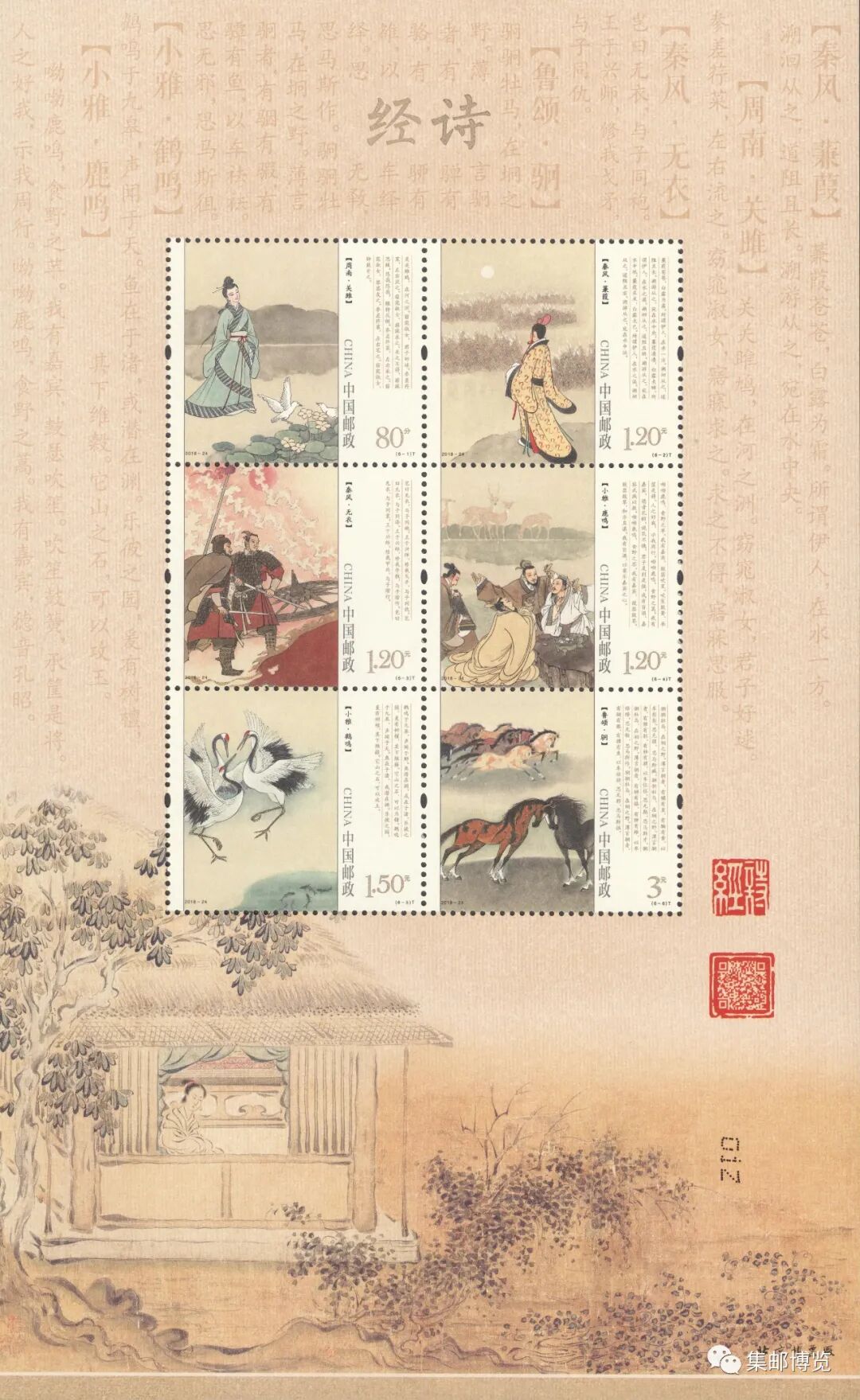 为了让整套邮票章法统一,使人物、动物、植物这些原本不宜“混居”安排、不好集中处理的元素,错落有致、均衡分布在全套邮票之中,高云在构图上统筹兼顾,采取“两两对应”的办法解决问题,如第1枚的淑女与第2枚的君子,一左一右,一前一后,两个人隔河相望,遥遥呼应,形成了有机的统一。第3枚、第4枚,武将与文人对应,一张一弛,正好形成反差;第5枚、第6枚,悠闲的仙鹤与奔腾的骏马对应,一动一静,也产生了对比。内容与形式结合,诗情画意合璧,流动着韵律感和和谐美,由此构成《诗经》邮票的一大看点和亮点。