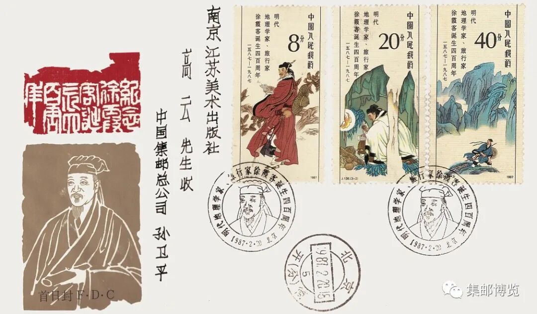 1987年发行的《明代地理学家、旅行家徐霞客诞生四百周年》邮票,是高云方寸之地的“处女作”。在设计时,他大胆创新,别开生面,运用中国画中工笔重彩的表现手法,用笔细腻,色彩明丽,使邮票显得古朴典雅,庄重大方,而在大构图上,用两道竖线框住了画面的左右,并把文字置于图上,使之成为全图的一个有机组成部分,体现了中国画中传统的立轴画格局,也给人物题材邮票的创作设计注入了一股前所未有之新风。