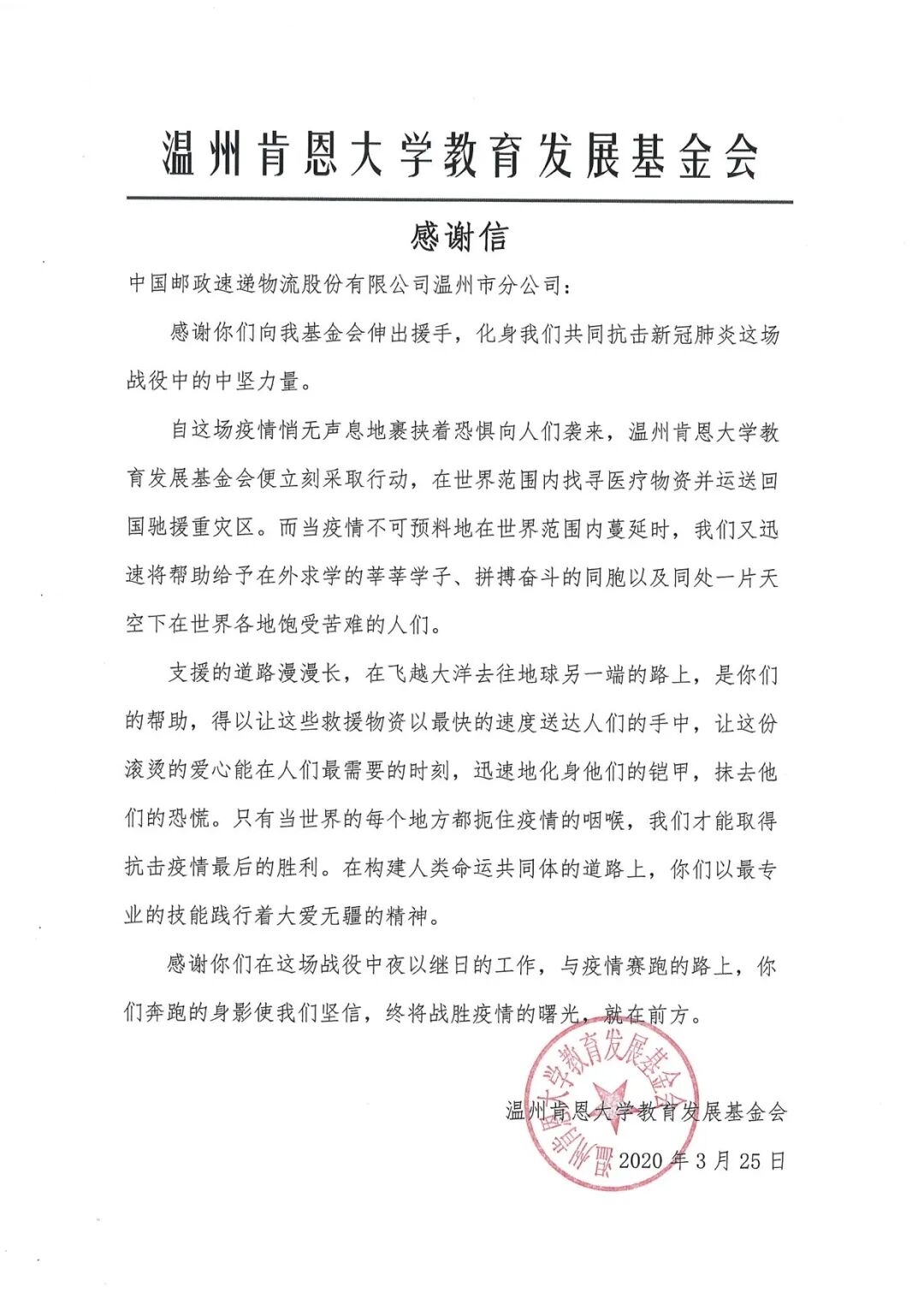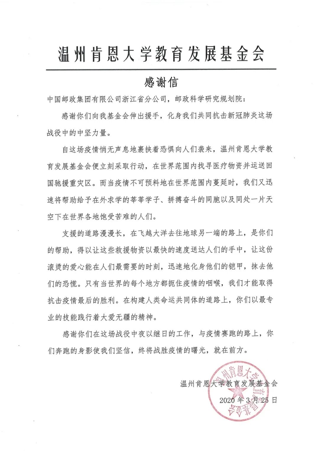一方有难,八方支援。“这次捐赠,还要感谢中国邮政提供的大力支持。在现在这样的情形下,他们为我们提供了最快最安全的运输服务。”在提及邮政给予的支援时,温州肯恩大学教育发展基金会秘书长孟骏说道。(王蓉蓉)