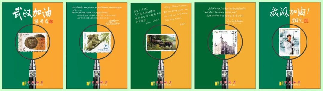 展示近70位国内外集邮界名家题签的“武汉加油”明信片,对英雄城市武汉表达深切祝福,以集邮方式传递战“疫”必胜的信心和力量。题签者包括:国际集邮组织和中华全国集邮联合会领导;国内外集邮名家;邮票设计家代表;集邮报刊社负责人等。