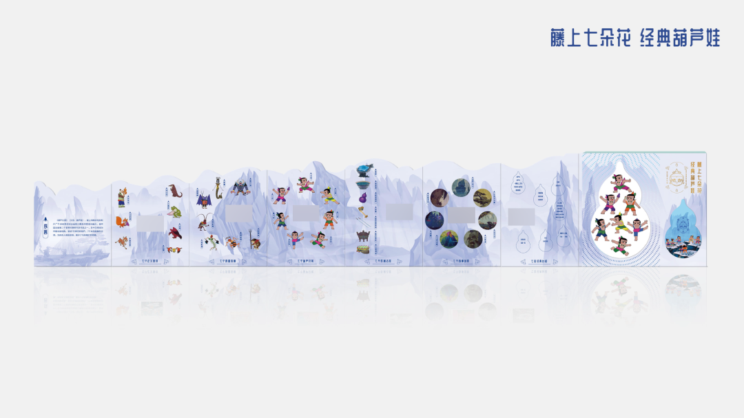 邮折展开是《葫芦兄弟》中经典七兄弟山峦场景,邮折背后的山峰空白处可自行DIY贴上附赠的《葫芦兄弟》的人物、妖精和法宝贴纸。上海美术电影制片厂有限公司授权出品,产品背后有授权防伪标记。
