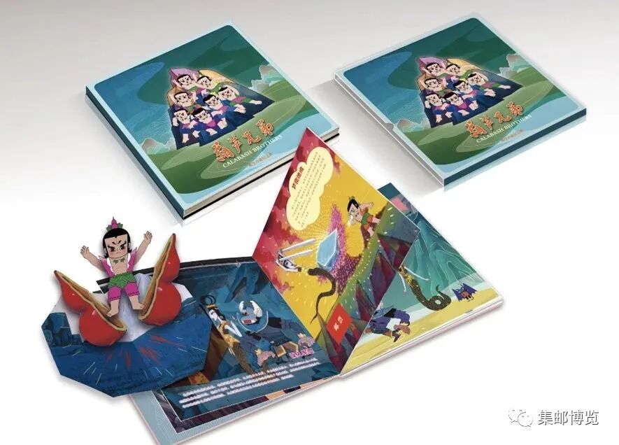 邮票书设计:立体邮票书可翻开,可拉动,为孩子带来生动形象的画面与故事场景,激发孩子们动手探索的需求,增加阅读乐趣,培养阅读习惯。采用动画片高清原图,原汁原味,加以3D场景演绎,帮助孩子们理解动画原理,仿佛置身其中,与葫芦兄弟一起齐心协力。