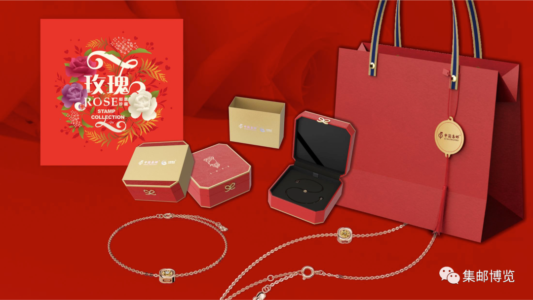 邮票资源与配件:“玫瑰之心”手链搭配《玫瑰》大版邮折,内含四版《玫瑰》邮票大版。