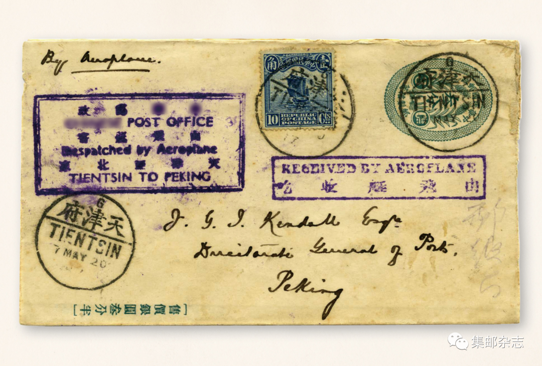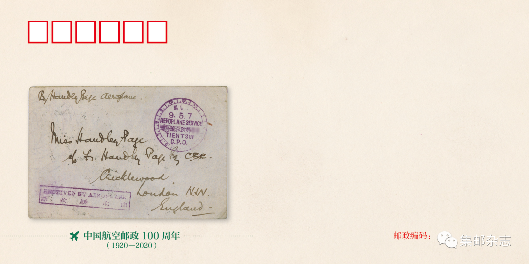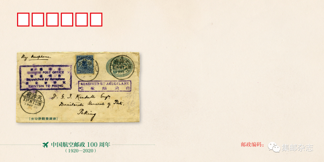 为配合“中国航空邮政100周年”邮资机宣传戳的启用,《集邮》杂志社特别制作纪念封、纪念明信片各2枚。纪念封及明信片图案为1920年中国首次航空邮政寄递实寄封。