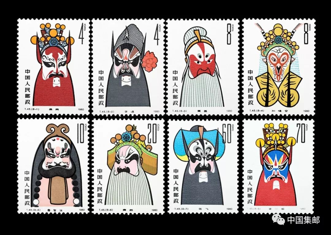 1980年,我国发行了T.45《京剧脸谱》特种邮票,邮票以色彩斑斓的脸谱,生动、形象地展现了正直忠勇的孟良、勇猛豪放的李逵、忠心耿耿的黄盖、活泼机智的孙悟空、豪爽坦荡的鲁智深、忠诚刚毅的张飞和盗御马的窦尔墩。