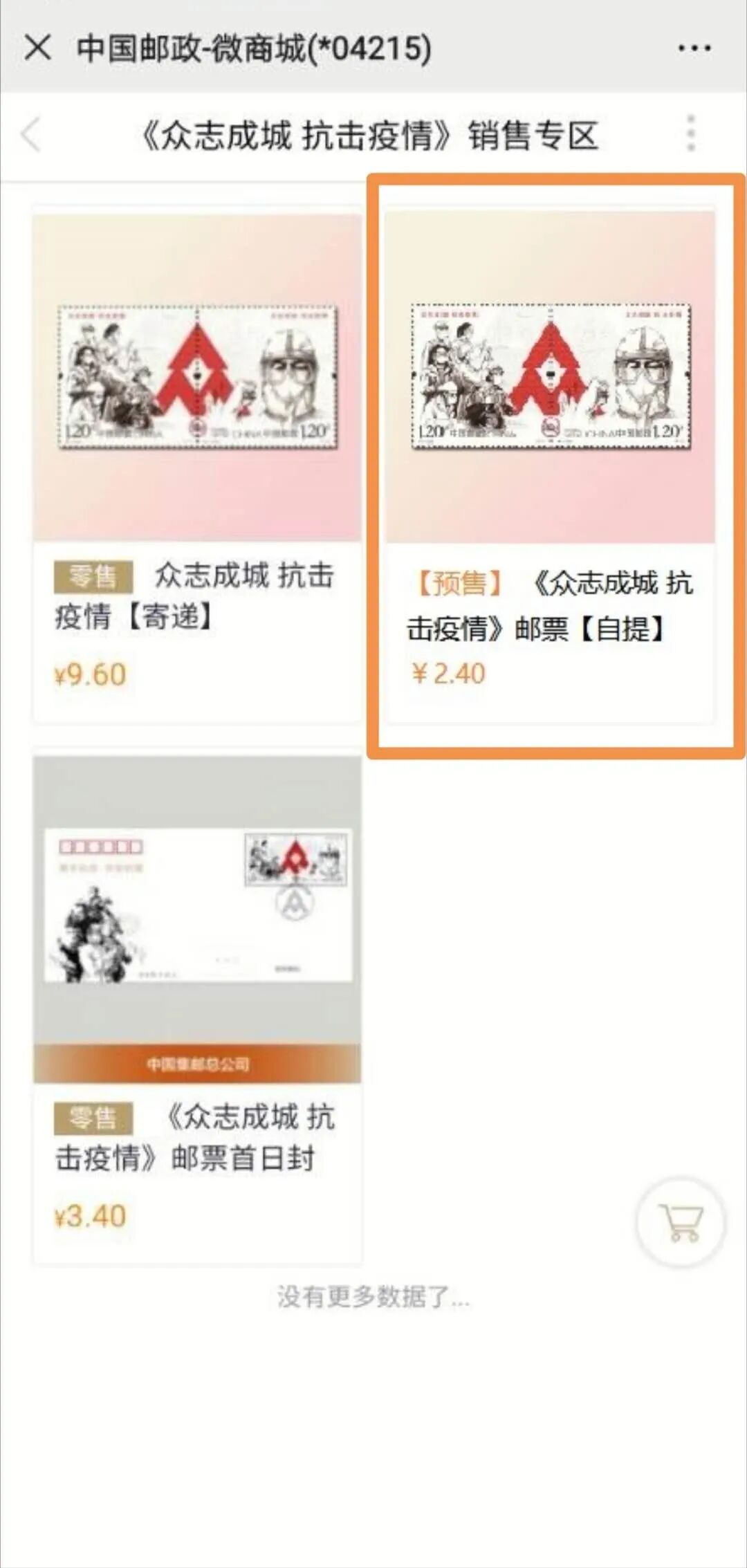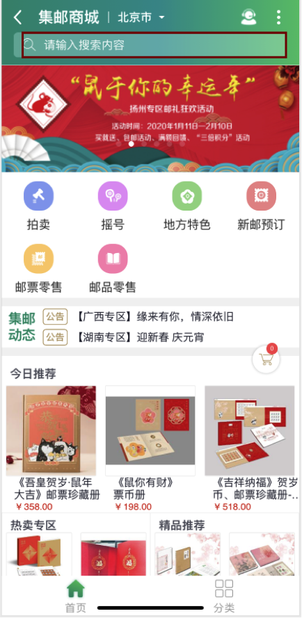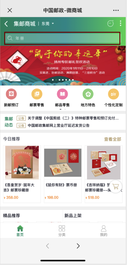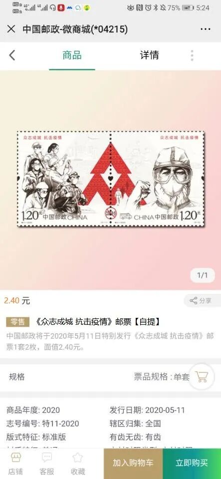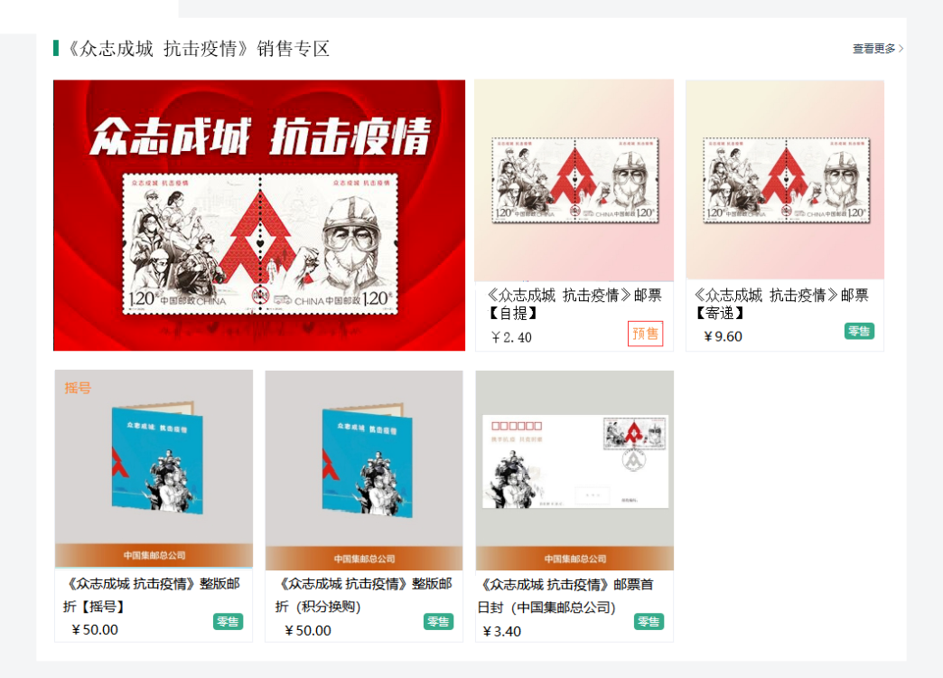 返回商城首页,在首页“《众志成城 抗击疫情》销售专区”或者点击搜索框输入《众志成城 抗击疫情》进行搜索,选择“《众志成城 抗击疫情》邮票【寄递】”或者“《众志成城 抗击疫情》邮票【自提】”。