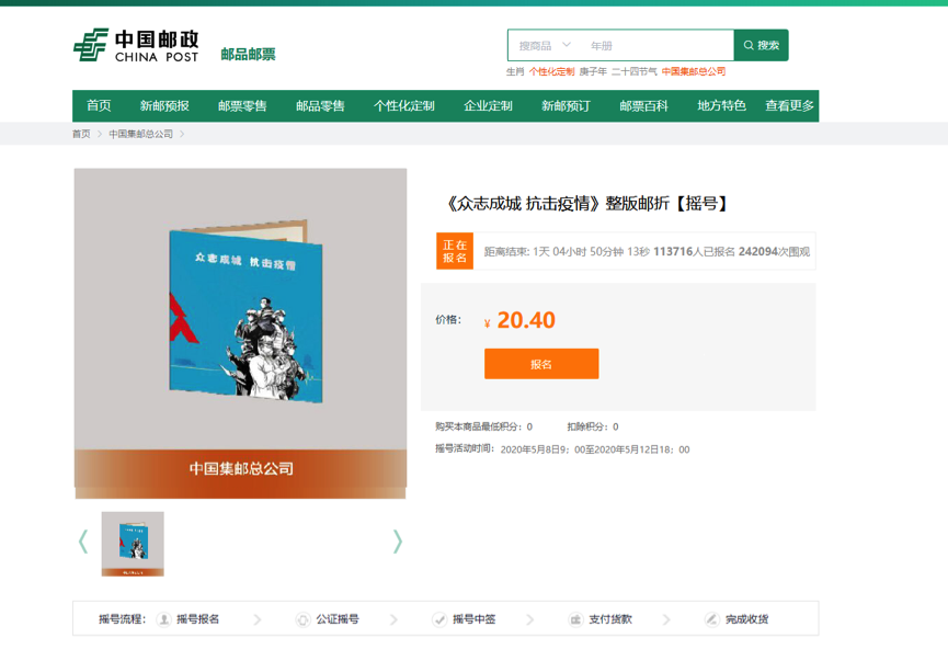 返回集邮频道首页,根据实际需要,在“《众志成城 抗击疫情》销售专区”选择“《众志成城 抗击疫情》整版邮折【摇号】”。