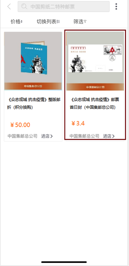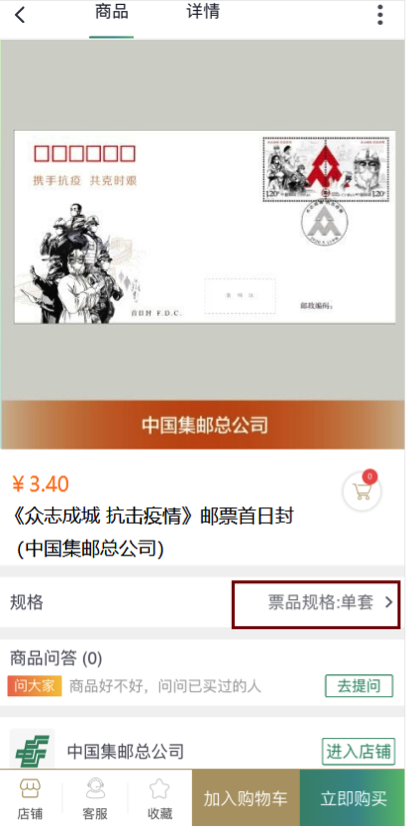 点击“商城”,点击“邮票邮品”分类,进入“集邮频道”首页;在首页的“《众志成城 抗击疫情》销售专区”或者点击搜索框输入“《众志成城 抗击疫情》邮票首日封”进行搜索,根据实际需要,选择“《众志成城 抗击疫情》邮票首日封(中国集邮总公司)”。