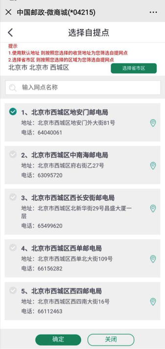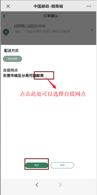 选择地址及配送方式,提交订单。(如果前面选择的是寄递商品,则默认配送方式是寄递;如果选择的是自提商品,则可以选择自提网点。若要更换配送方式,需重新选择商品。)