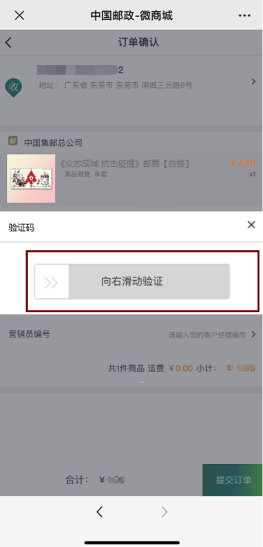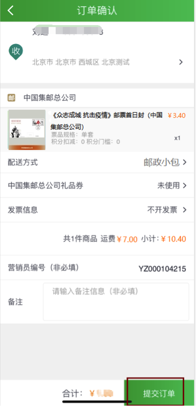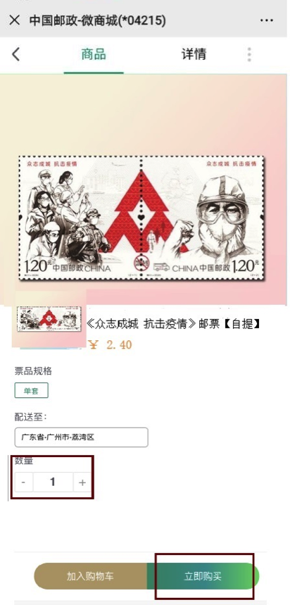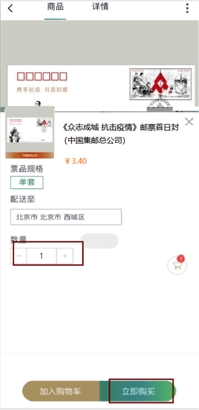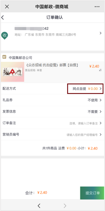 选择地址及配送方式,提交订单。《众志成城 抗击疫情》邮票首日封仅支持寄递。