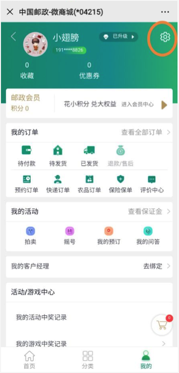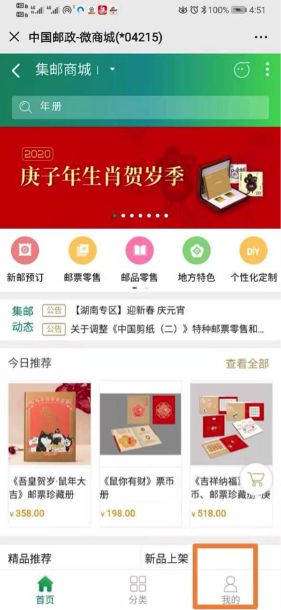 如下图所示,通过“微商城”进入“集邮商城”,点击“我的”,根据提示输入个人相关信息,完成注册。