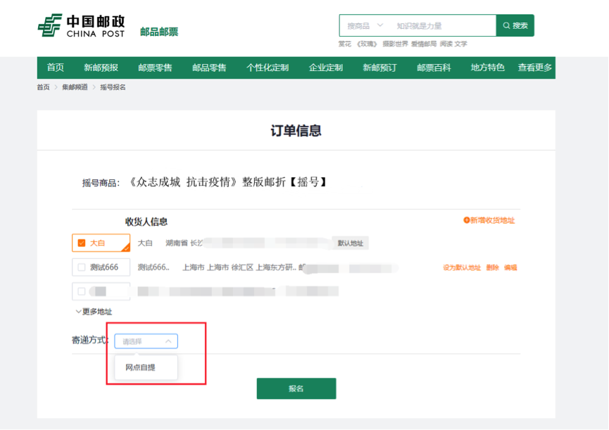 选择地址及寄递方式,提交报名。