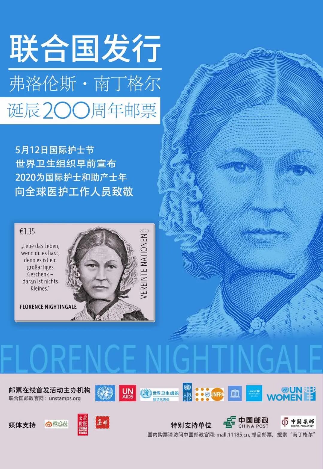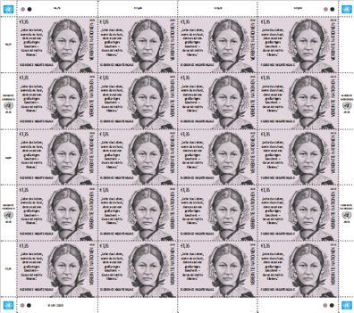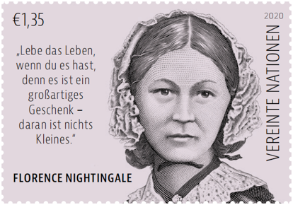 联合国邮政于2020年5月12日发行“弗洛伦斯·南丁格尔诞辰 200周年——国际护士和助产士年2020普通邮票”一套一枚,面值为1.35欧元,由挪威著名艺术家马丁·莫克先生设计,主图为南丁格尔肖像,左侧用德文书写她的名言“Lebe das Leben, wenn du es hast, denn es ist ein großartiges Geschenk – daran ist nichts Kleines.”(翻译:且生活,且珍惜。生命是馈赠——生命无小事),右侧文字为德文书写的“联合国”。