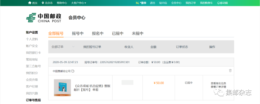 《众志成城 抗击疫情》整版邮折中签名单已于5月13日在中国集邮网厅公布,参加本次摇号的朋友可以查询自己是否中签了。如您已中签,请于5月17日至27日凭预约登记的二代身份证原件(或集邮联名卡)到所选自提网点进行支付并自提产品。逾期未领取,视为自动放弃指标。