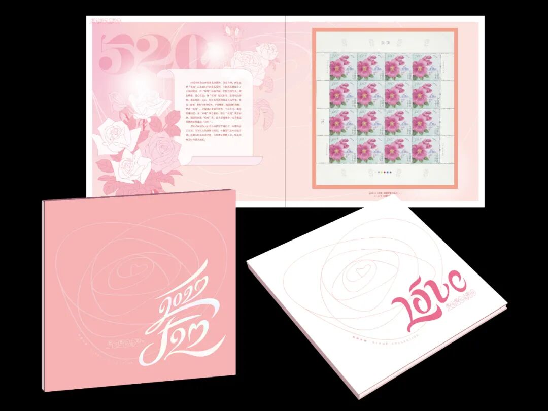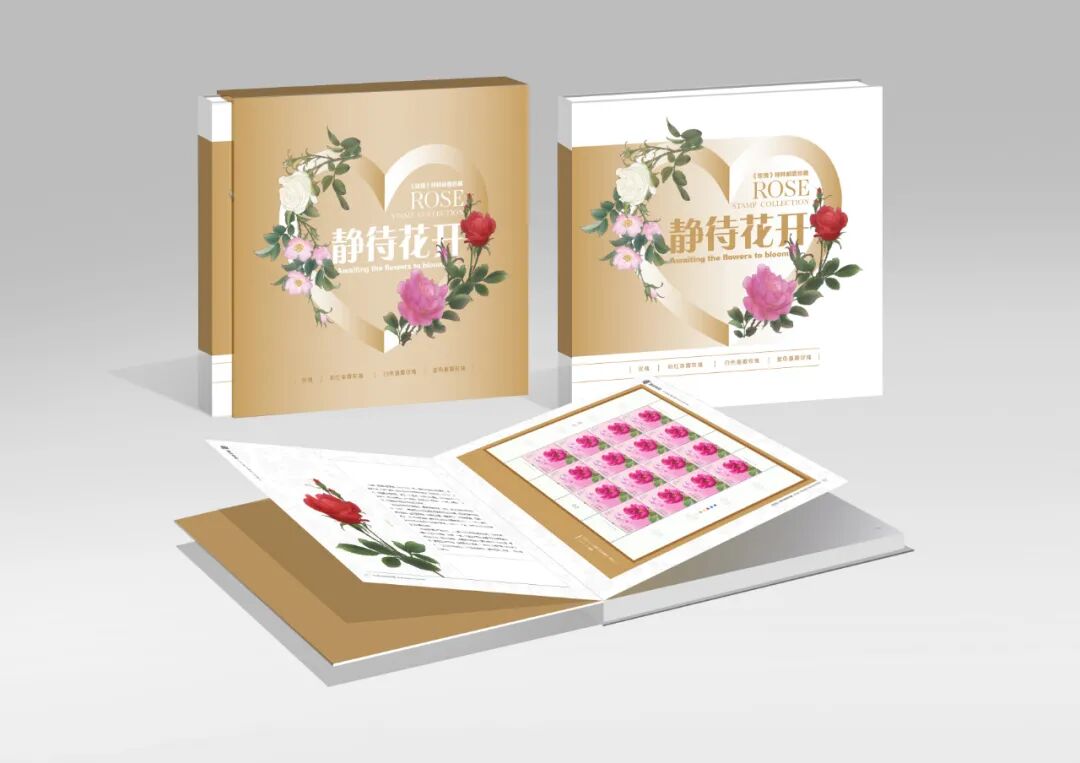 邮册设计上,以象征爱情的心形为基础,将玫瑰围绕在心形图案之上,突出玫瑰主题,暖暖的黄色调也彰显了玫瑰的温暖、爱情的美好。