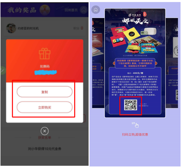 2.获得的代金券以优惠券码方式发放。可在活动页面“我的奖品”中,奖列表中“复制”妥善保存,或可点击“立即购买”,选择本期指定活动商品邮票珍藏册商品海报后,扫码进入对应商品详情页,在订单支付前,依次选择:“礼品券-使用礼品券”,输入券码复制代金券码下单抵扣货款使用。