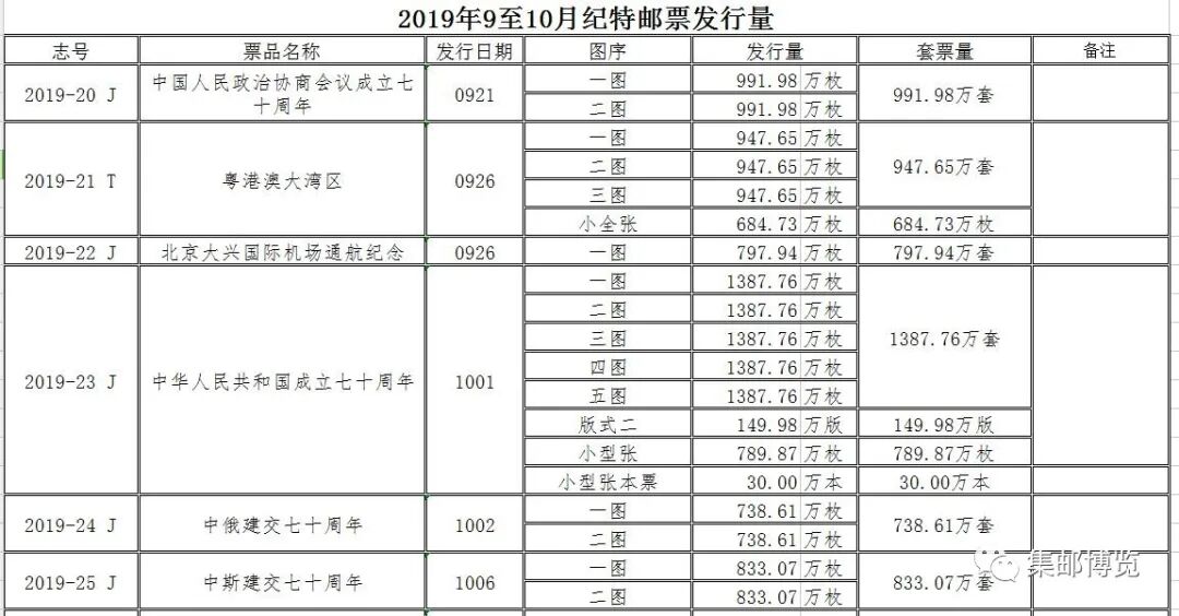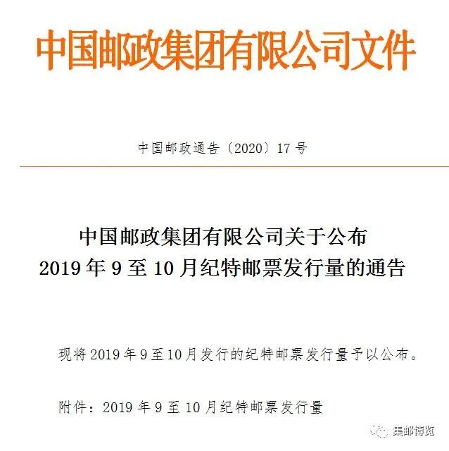 中国邮政集团关于公布2019年9至10月纪特邮票发行量的通告