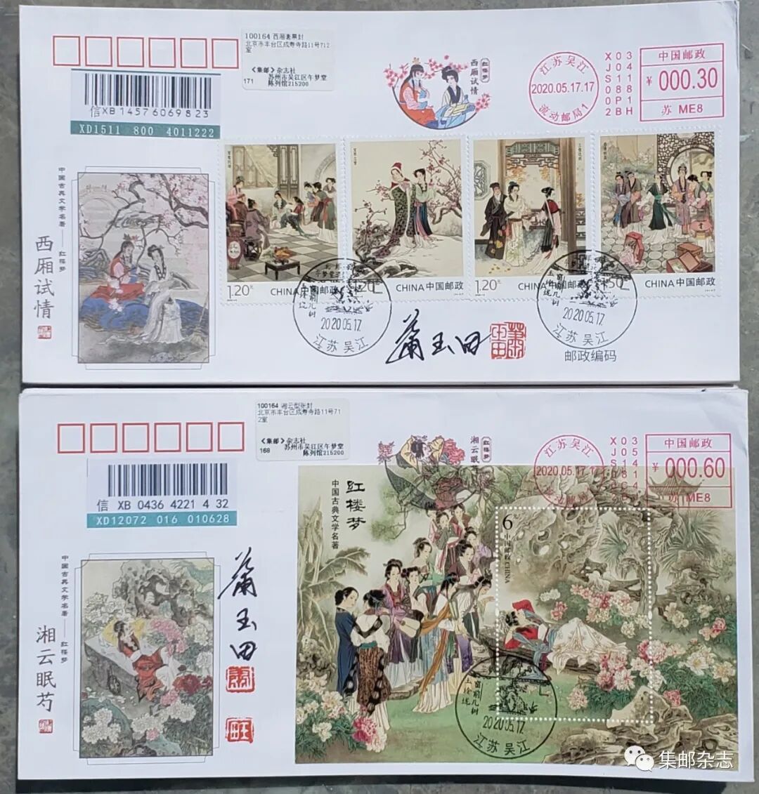 5月17日,《集邮》杂志社使用《中国古典文学名著——〈红楼梦〉》(四)邮票和“湘云眠芍”“西厢试情”邮资机宣传戳制作了实寄封。我们还邀请了萧玉田老师在实寄封上亲笔签名并加盖名章。