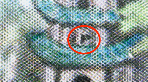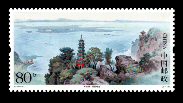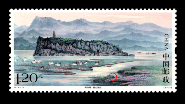 那么在这枚邮票中,又采用了什么样的防伪手段呢?注意在小编画圈的位置,在高倍放大镜下,我们可以清楚地看到邮票中的微缩文字暗记为“PYH”,即“鄱阳湖”的汉语拼音首字母。