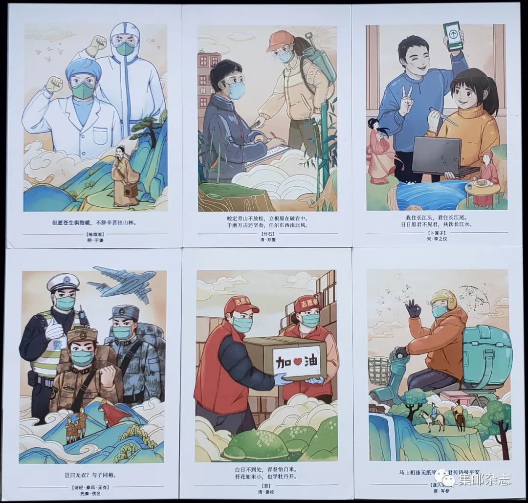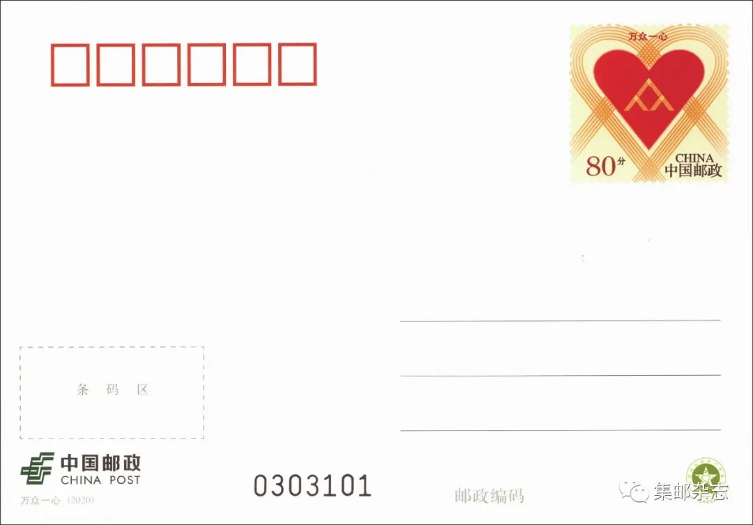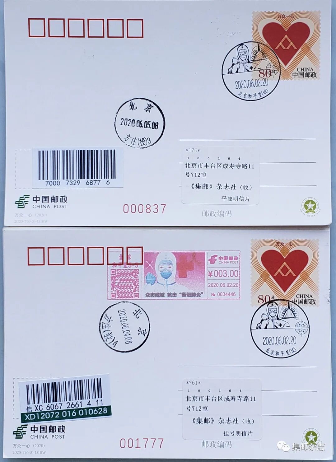 6月2日,《集邮》杂志社制作了《万众一心》实寄加印明信片,每套实寄片包含12枚,其中6枚为平寄,加盖“抗击新冠肺炎疫情”文化日戳(试用);另6枚为挂号实寄,除加盖“抗击新冠肺炎疫情”文化日戳(试用)外,还使用“众志成城 抗击‘新冠肺炎’”邮资机宣传戳补足挂号资费。