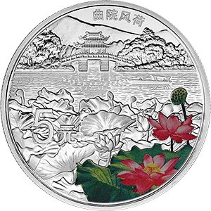 中国人民银行于2014年5月30日发行了世界遗产——杭州西湖文化景观金银纪念币一套。该套纪念币共8枚,包括金币3枚,银币5枚,均为中华人民共和国法定货币。其中有一枚“曲院风荷”1/2盎司银币,正面图案为中华人民共和国国徽,并刊国名、年号;背面图案为“曲院风荷”景观,配以荷花造型等的组合设计(局部彩色),并刊“曲院风荷”字样及面额。