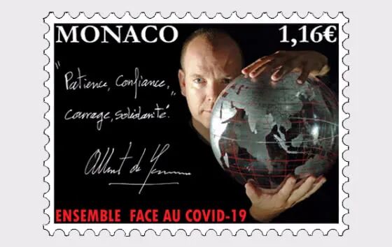 2020年6月3日,摩纳哥邮政发行一枚《团结抗疫》邮票。摩纳哥的阿尔贝二世亲王于3月19日被确诊感染新冠肺炎并出现轻微症状,随后立即接受医学隔离观察。3月31日,亲王痊愈,解除医学隔离,目前身体健康。邮票图案上有亲王手书“耐心,自信,勇气和团结”,号召民众团结一心抗击新冠疫情。
