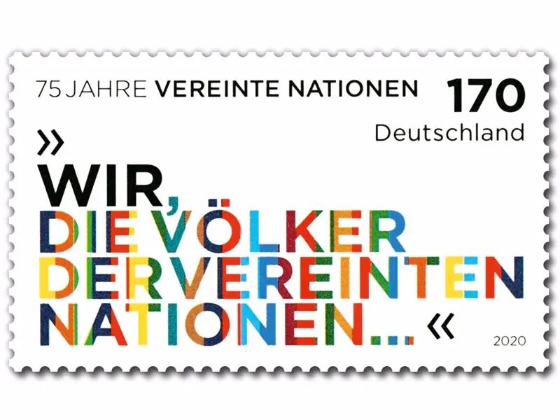 2020年6月4日,德国邮政发行一枚邮票,庆贺联合国建立75周年。1945年4月25日,来自50个国家的280多名代表和1700多名顾问、专家及记者聚集一堂,在美国旧金山召开联合国国际组织会议。中国代表团由10人组成,其中包括中国共产党的代表董必武。会议起草了《联合国宪章》。6月25日,代表们在旧金山歌剧院一致通过了《联合国宪章》。6月26日,制宪会议在旧金山退伍军人纪念堂礼堂进行最后一项,也是此次大会最庄重的议程—与会代表在宪章上签字。按照大会商定的程序,中国代表团第一个签字。正午时分,董必武用毛笔在宪章上写下了自己的名字。