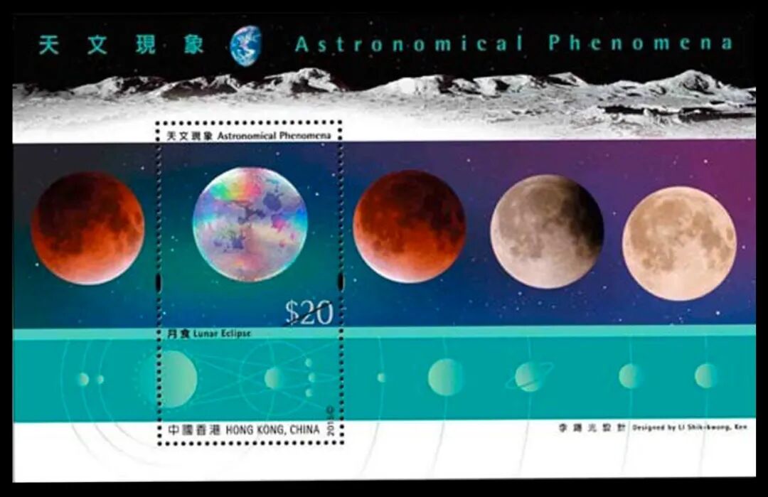 同时发行面值不同,图案相同的两枚小型张,小型张以月食全过程的景象为主图,其中面值为20元的月食邮票小型张以平版加3D全息箔片及缩微压印技术印制,使月球图案能更逼真浮现于眼前。
