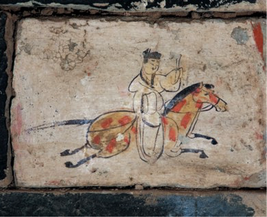“驿使图”壁画砖,长35厘米,宽17厘米。砖上绘一信使,头戴黑帻,着皂缘领袖中衣,左手持棨(qǐ)传文书,跃马疾驰。棨传为通过关卡、驿站时的信物。画师寥寥几笔,便生动再现了当时西北边疆驿使驰送文书的情景,客观真实地记录了距今1600多年前这一地区的邮驿情形。
